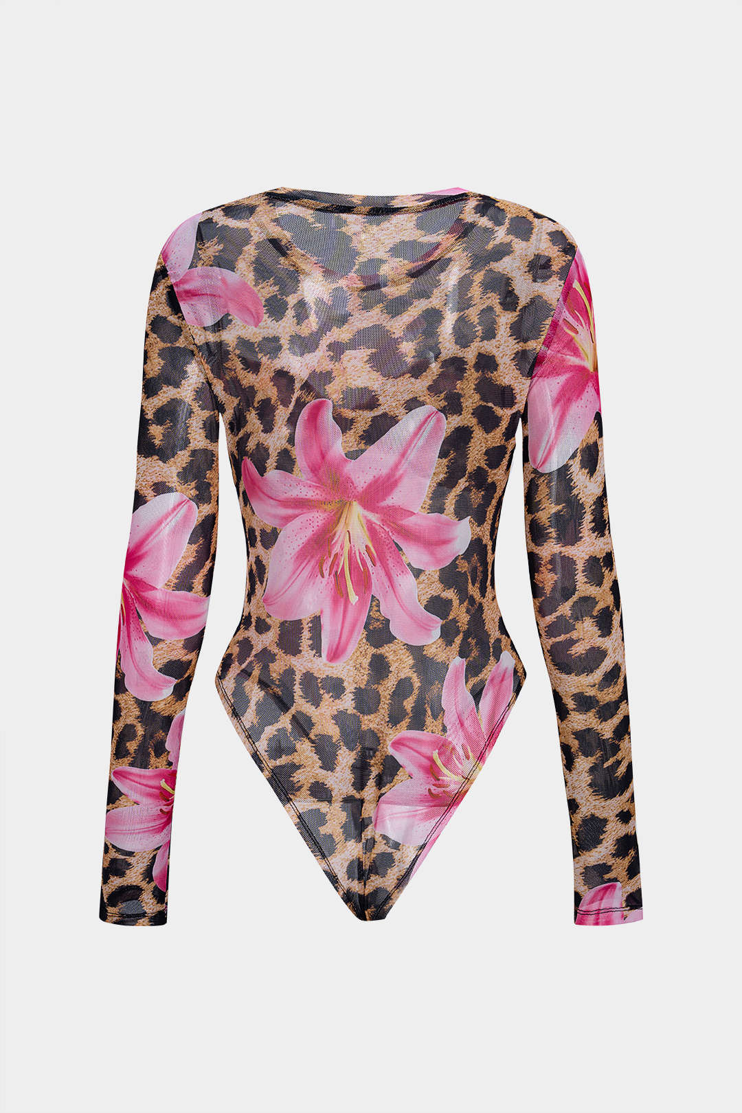 Leopard Floral Print Mesh Round Neck Long Sleeve Bodysuit