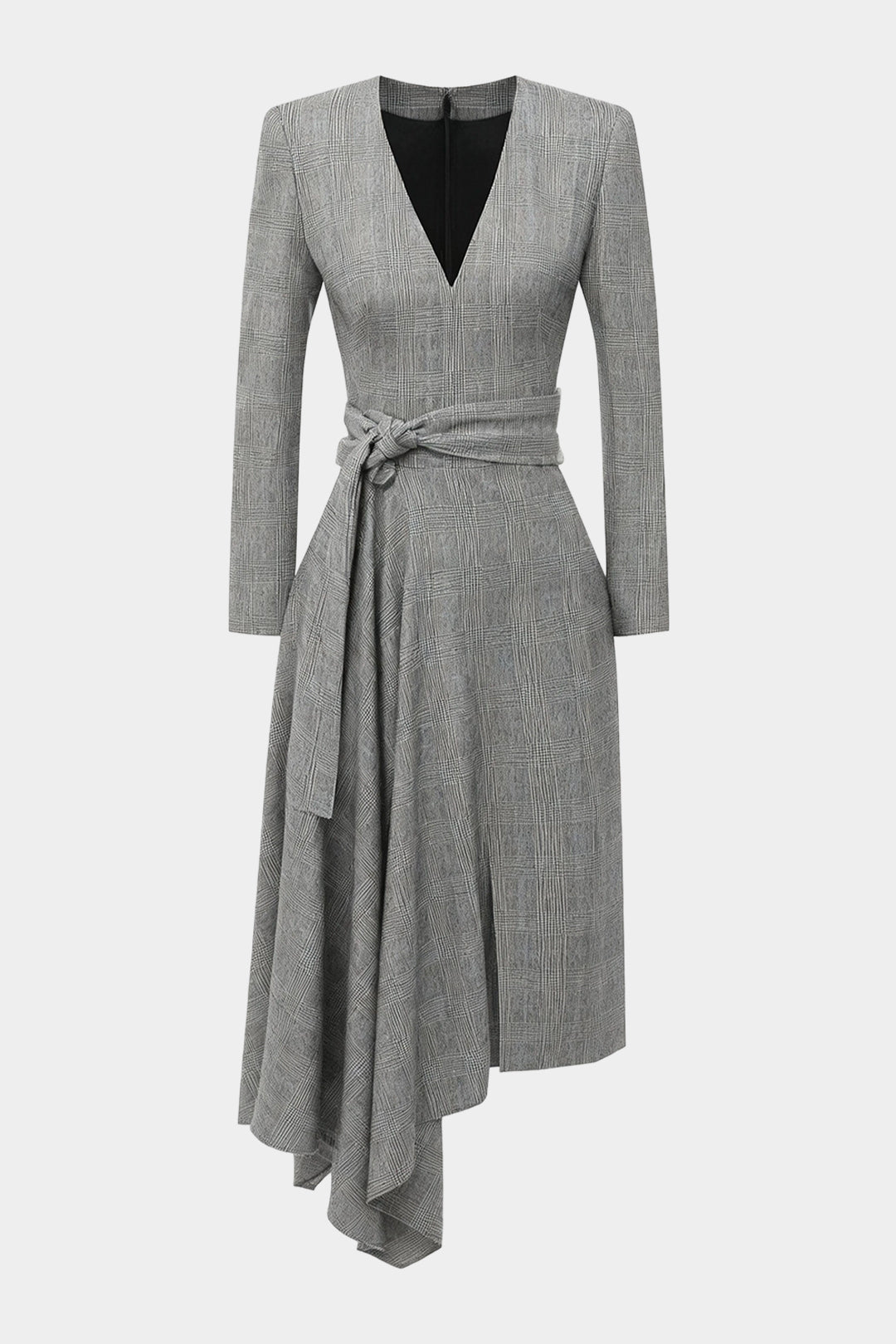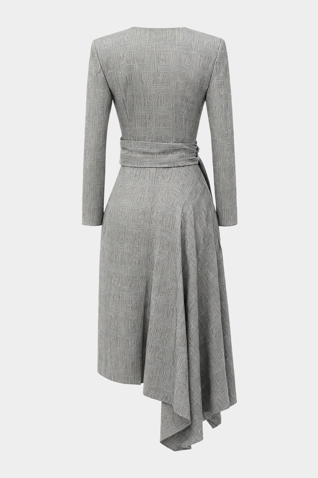 Plaid Print V-Neck Knot Ruched Asymmetrical Hem Long-Sleeve Midi Dress