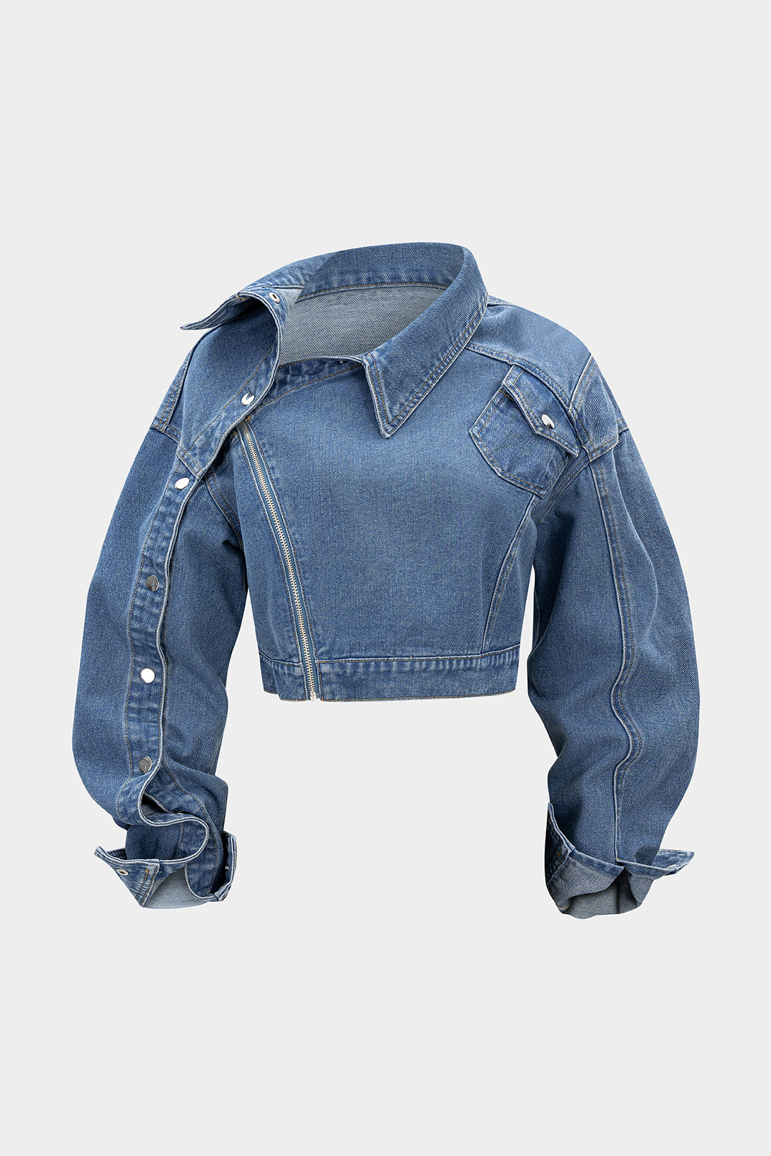 Denim Asymmetrical Zipper Long-Sleeve Top