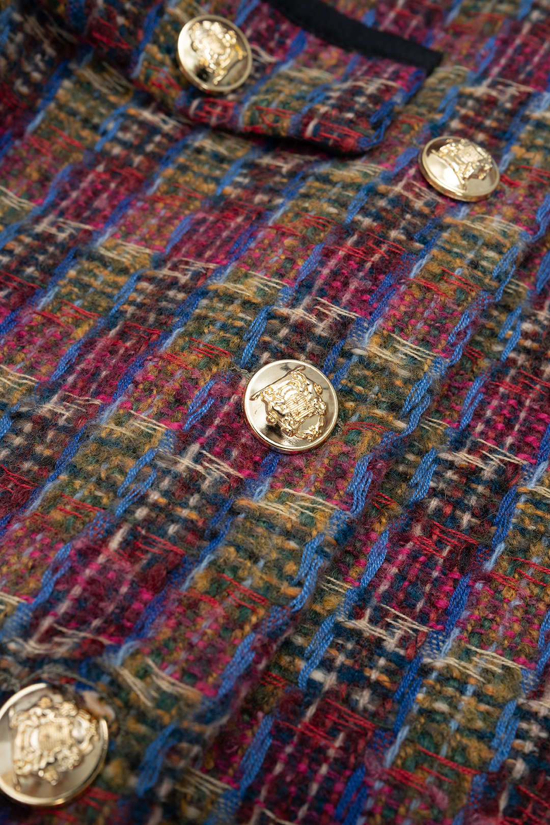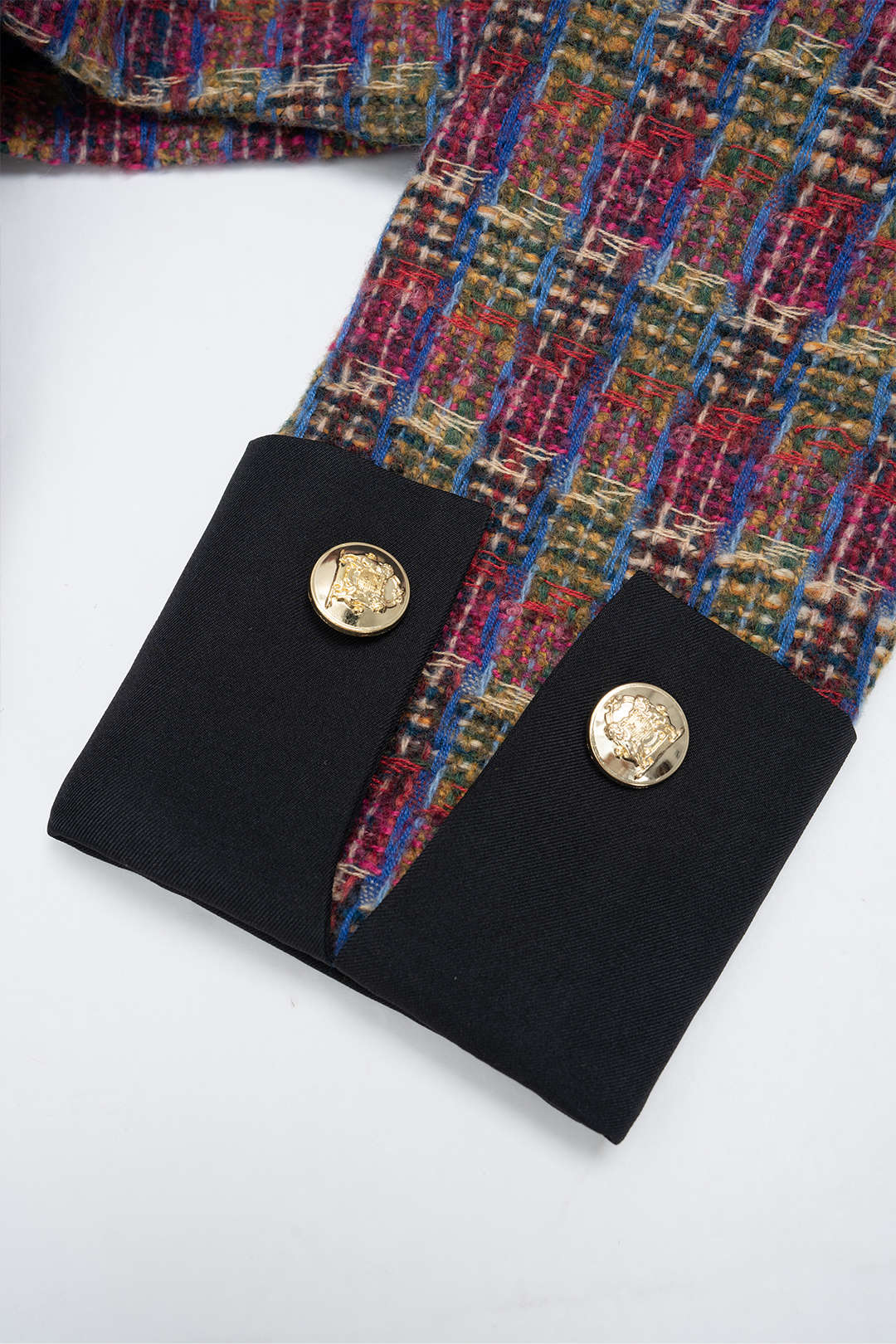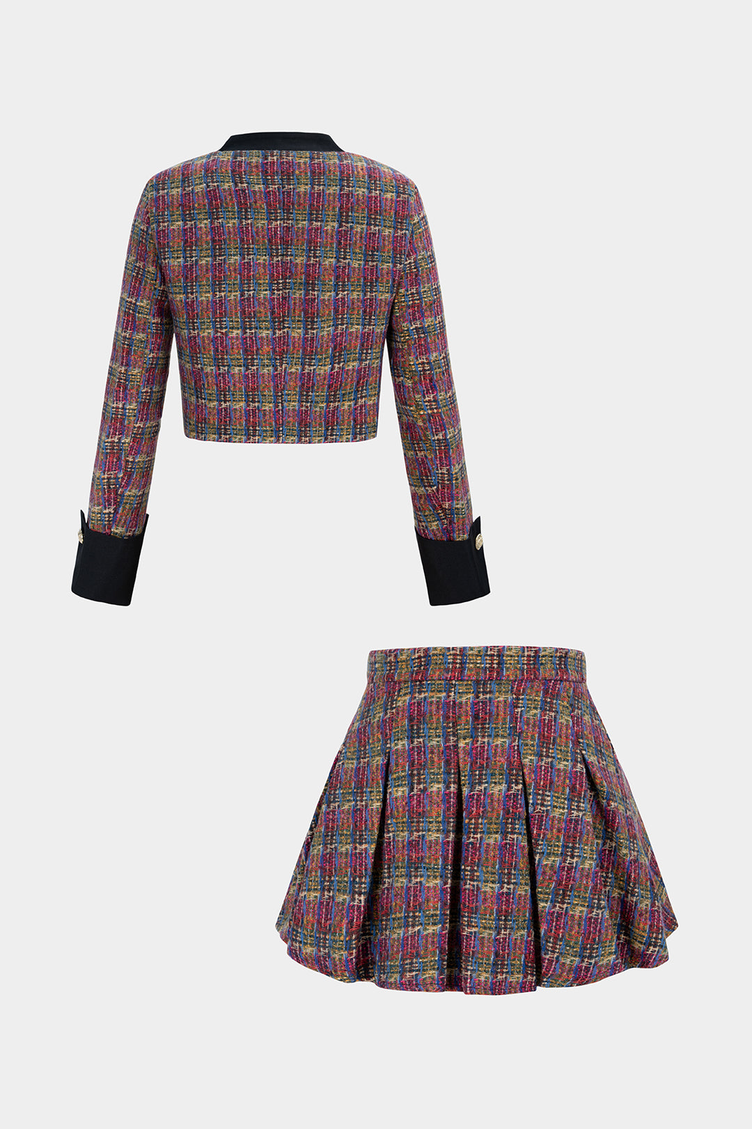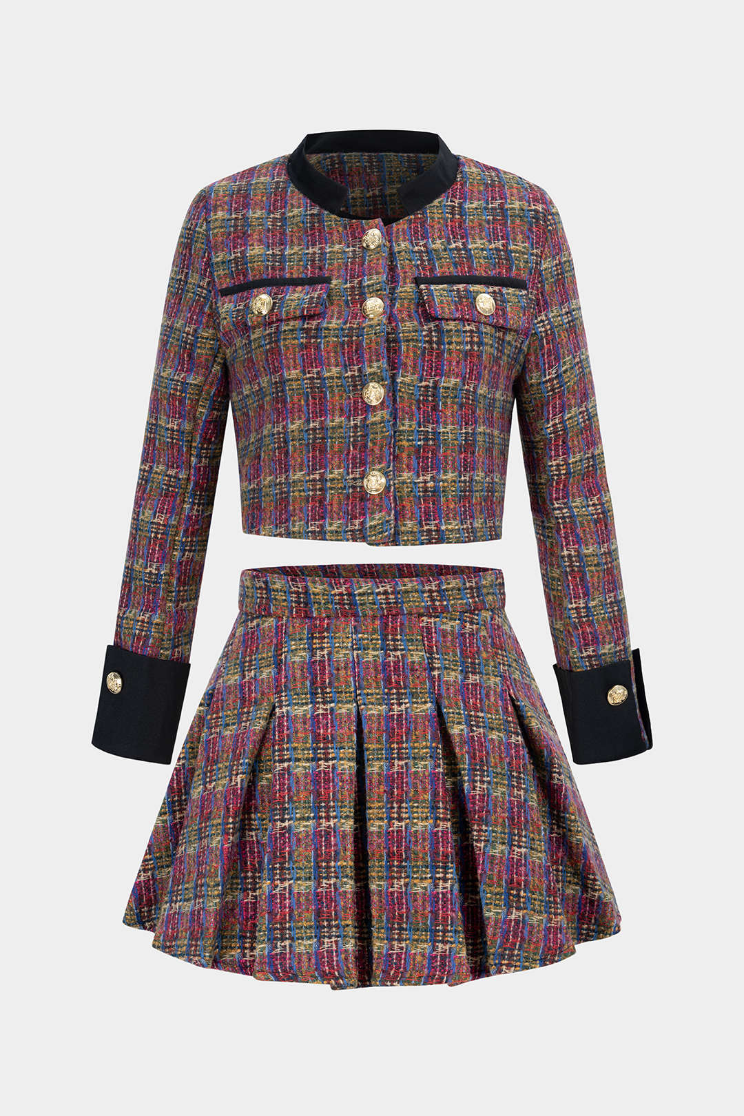 Tweed Patchwork Button Pockets Jacket And Pleated Mini Skirt Set