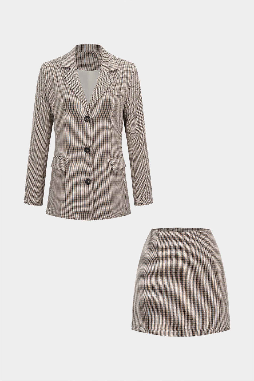 Plaid Print Notched Lapel Button Blazer And Mini Skirt Set