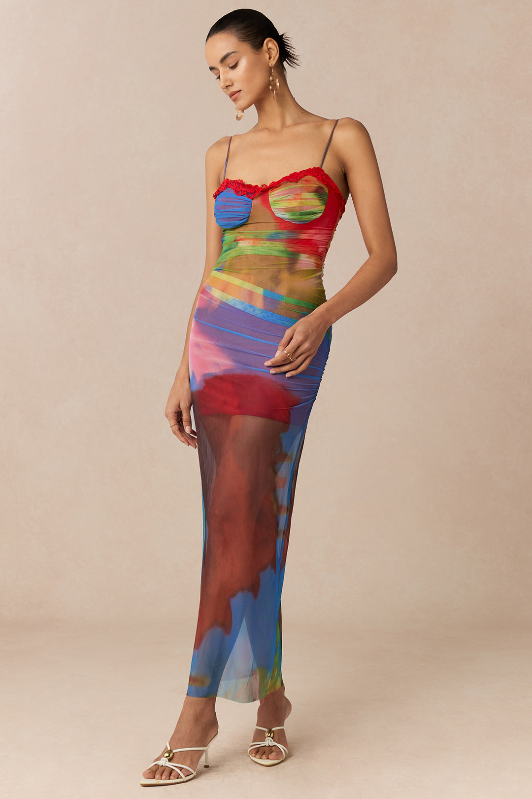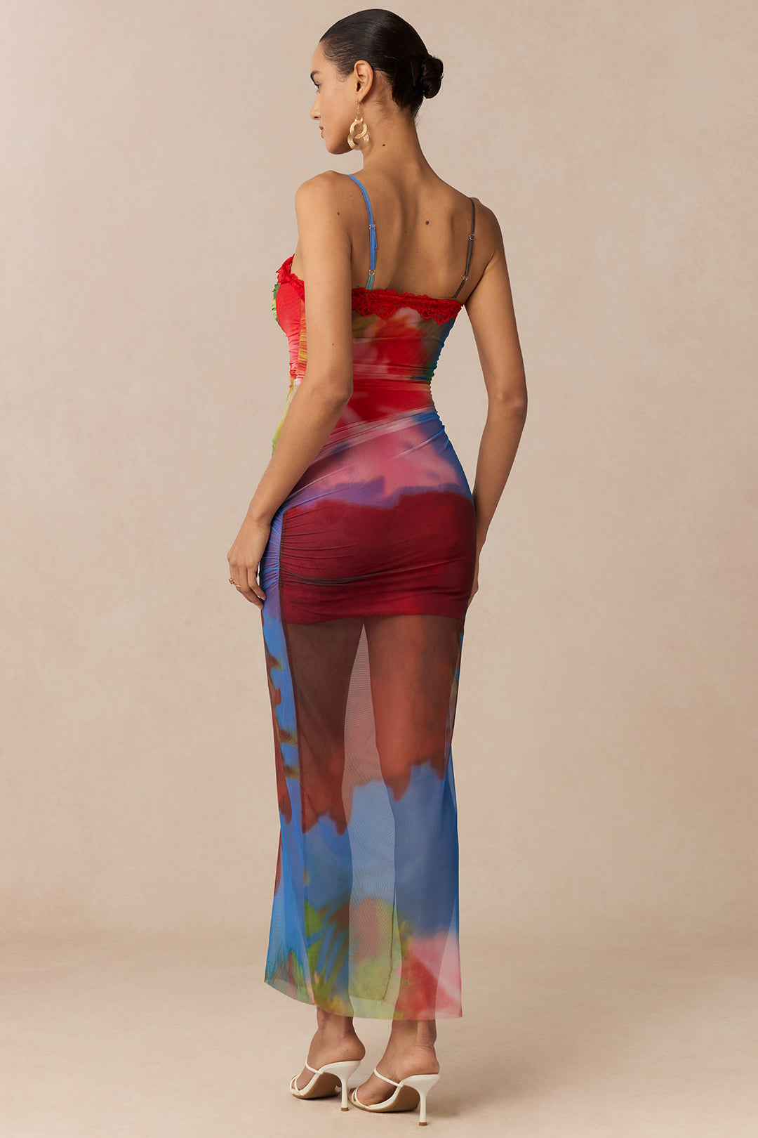 Multicolor Abstract Print Mesh Patchwork Lace Trim Asymmetrical Ruched Sleeveless Maxi Dress