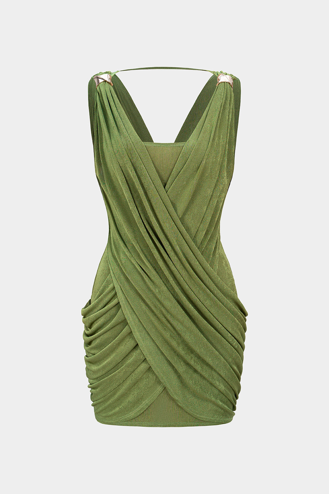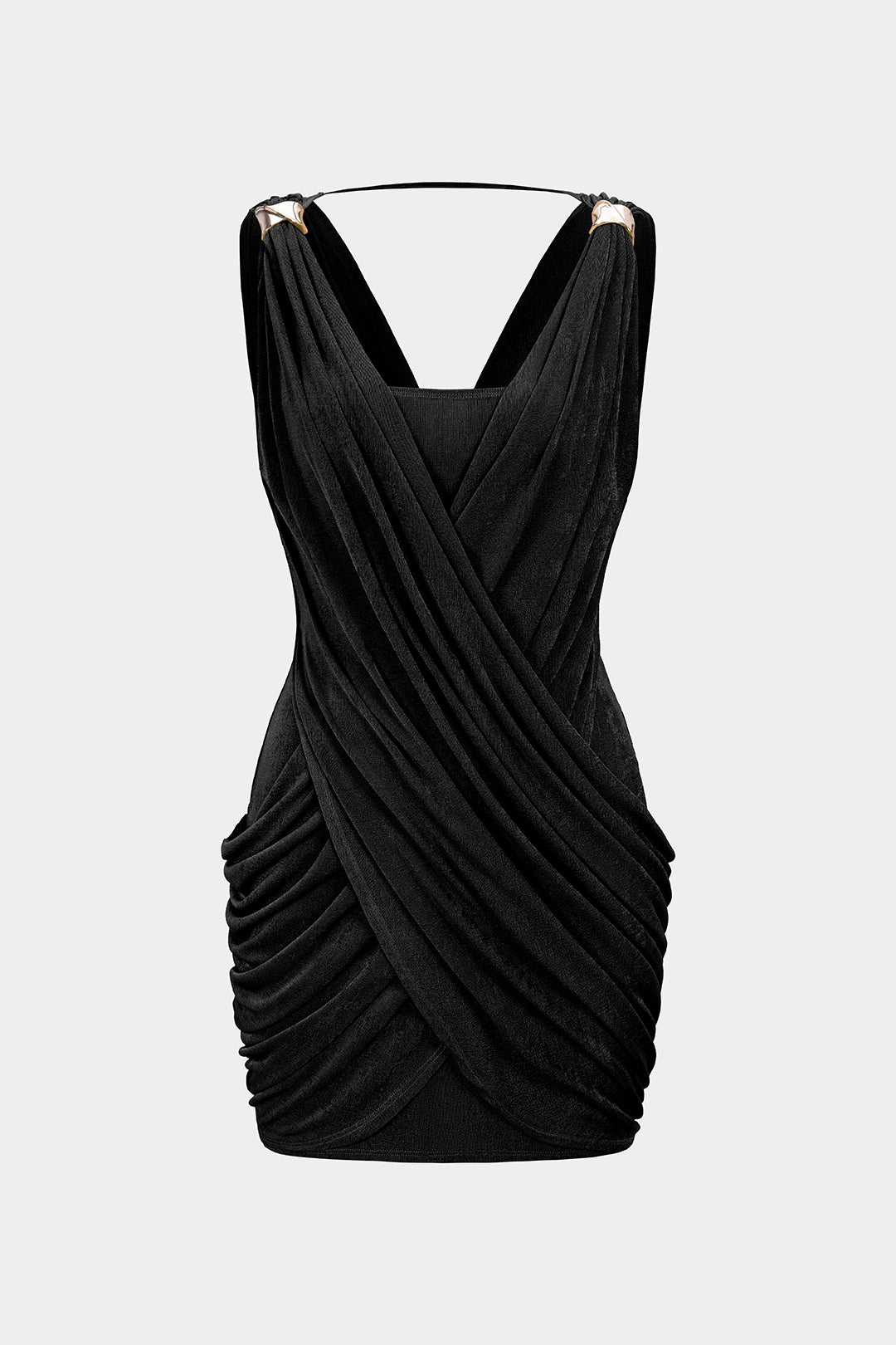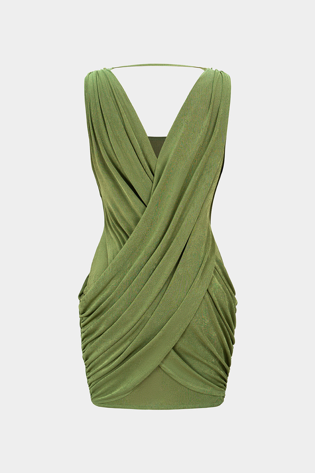 Crossed V-Neck Ruched Metallic Decor Sleeveless Mini Dress