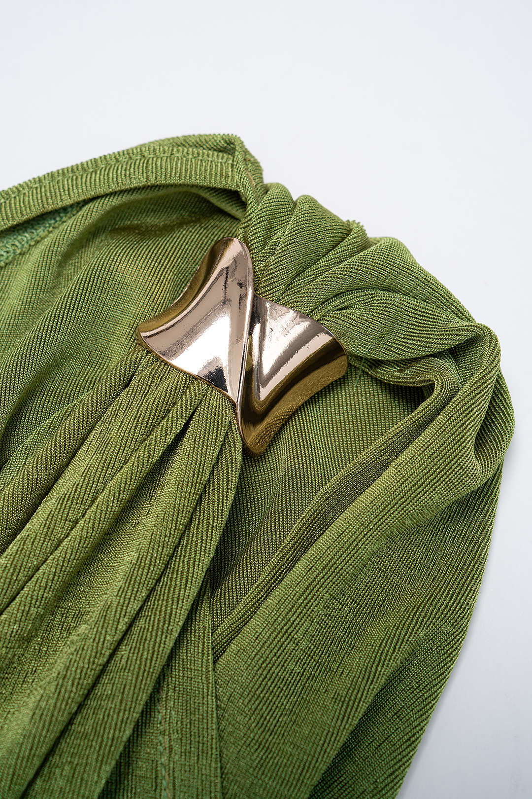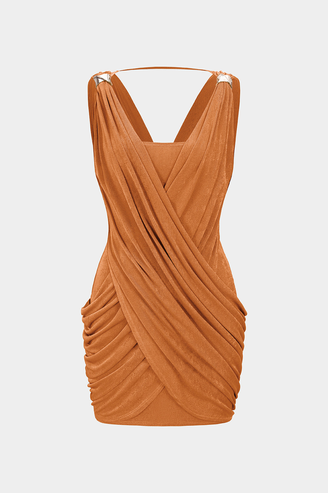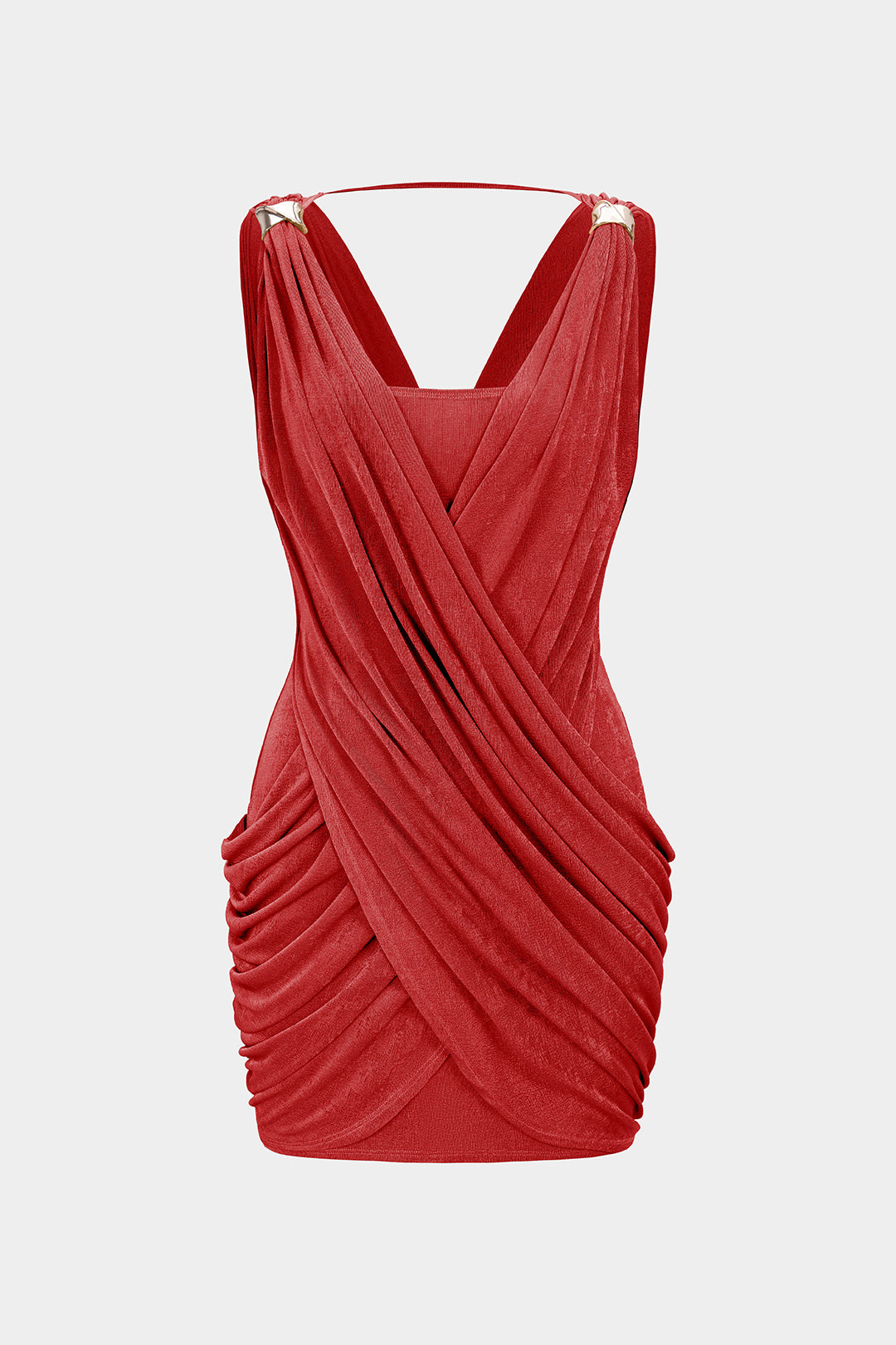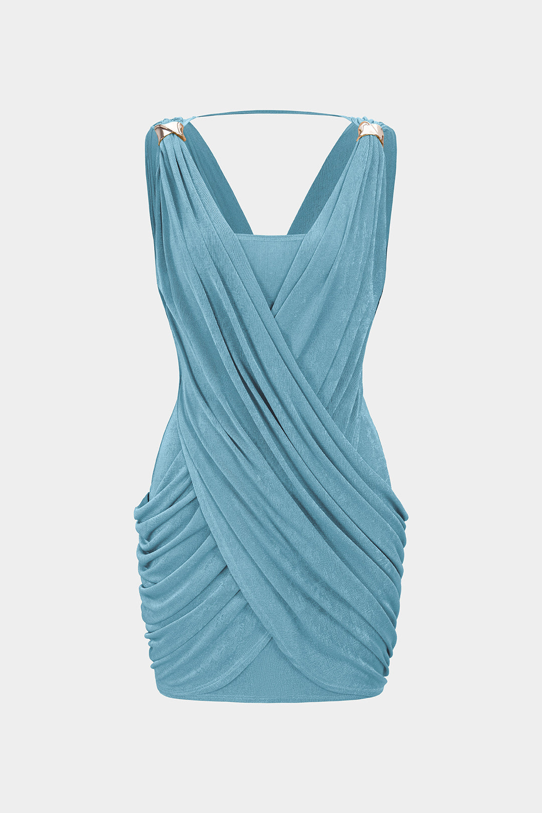 Crossed V-Neck Ruched Metallic Decor Sleeveless Mini Dress