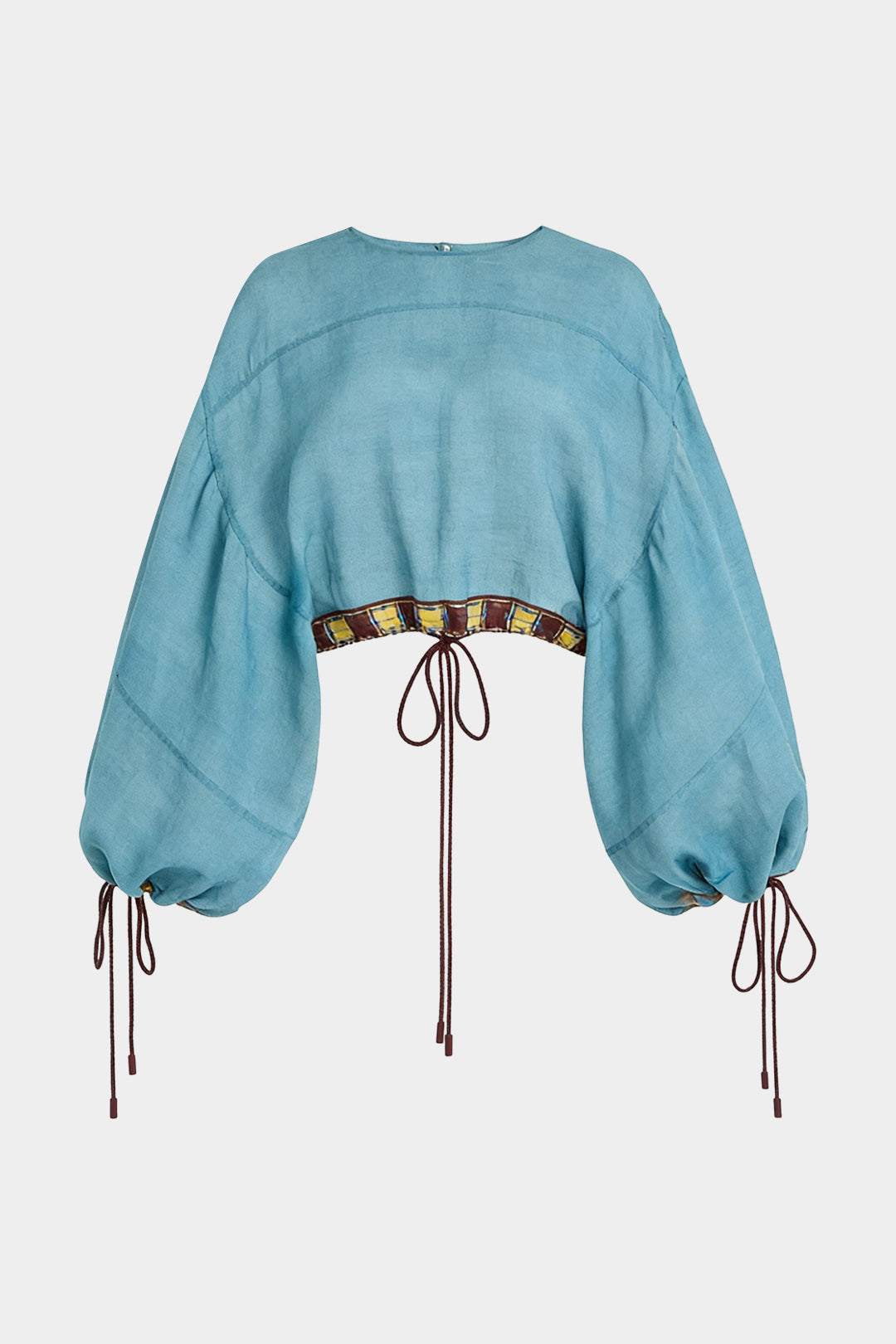 Geometric Print Linen Patchwork Round Neck Drawstring Long Sleeve Top