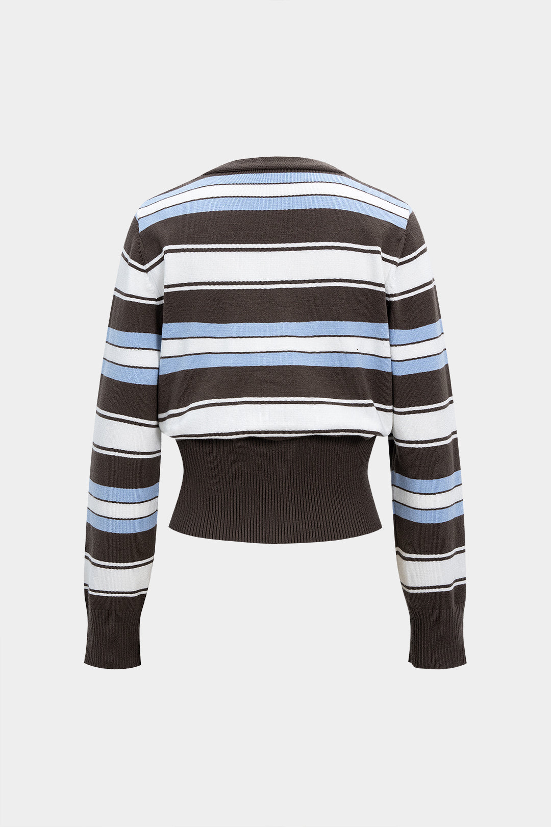Knit Contrast Stripes Print V-Neck Button Long-Sleeve Top