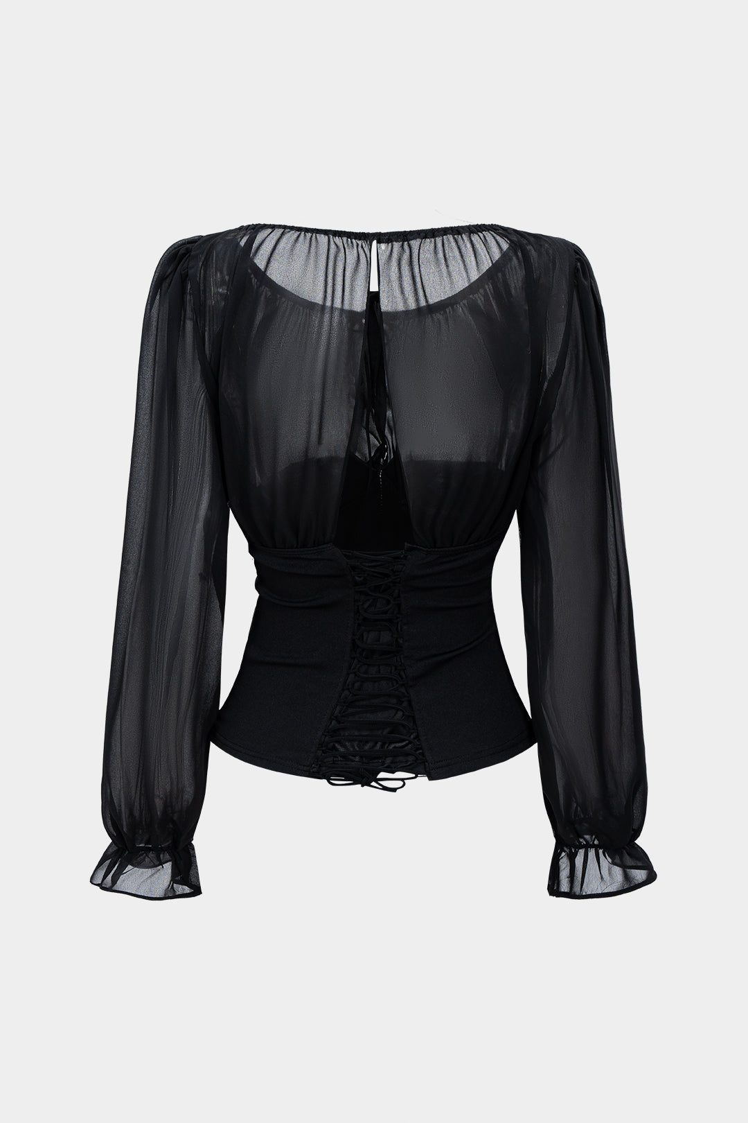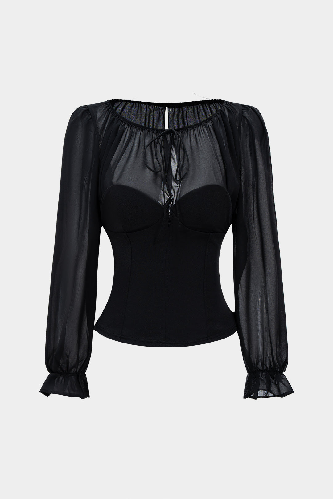 Chiffon Patchwork Tie-Up Puff Long-Sleeve Shirt