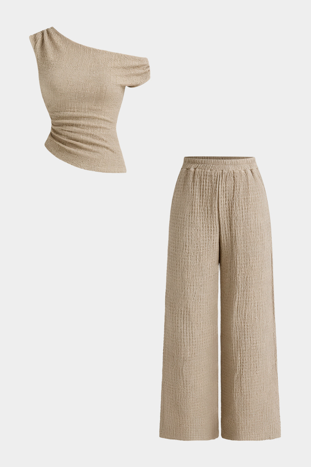 Textured One-Shoulder Ruched Top And Elastic Waistband Wide-Leg Pants Set