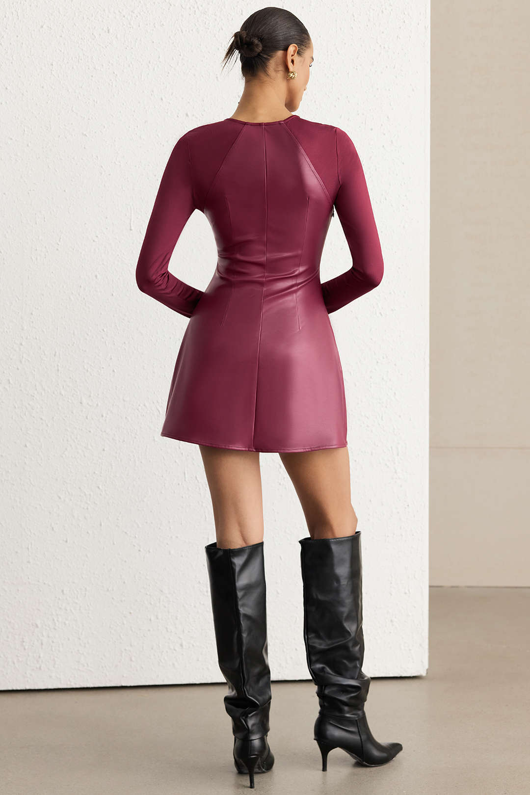 Faux Leather Patchwork Ruched V-Neck Long Sleeve Midi Dress