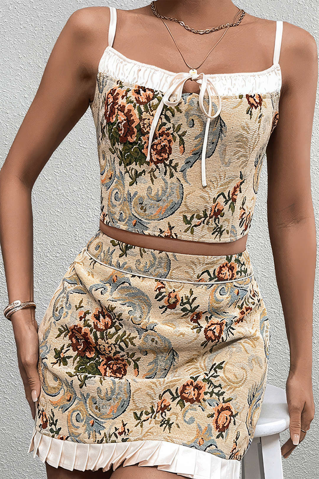 Satén Jacquard Ruched Patchwork Tie Front Zipper Slip Top a sukně