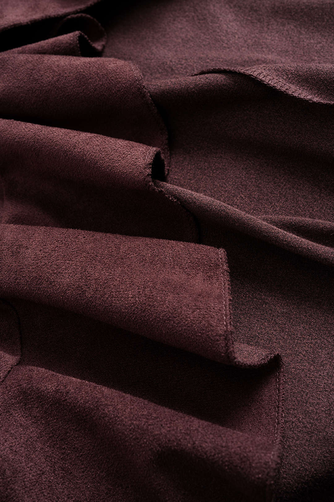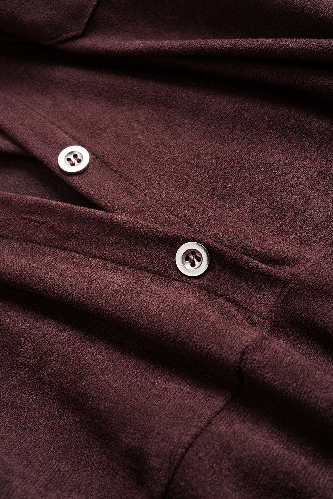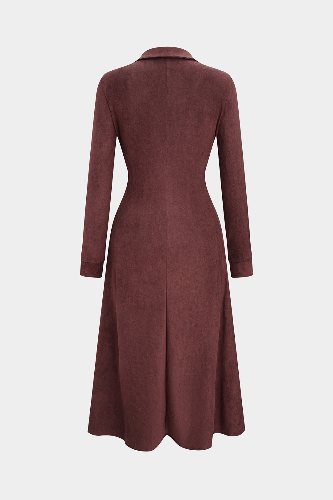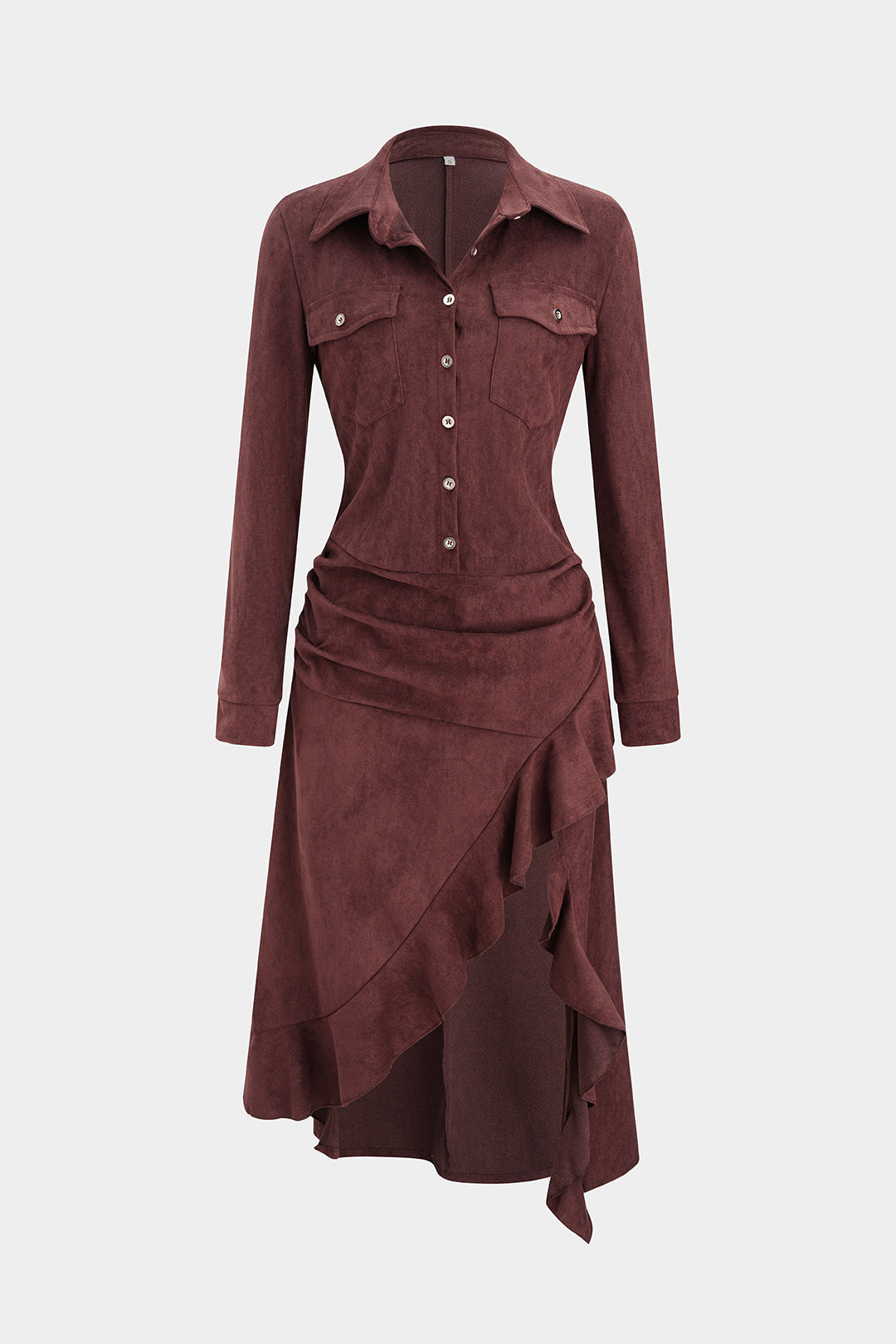 Suede Ruched Pocket Button Ruffle Hem Midi Dress