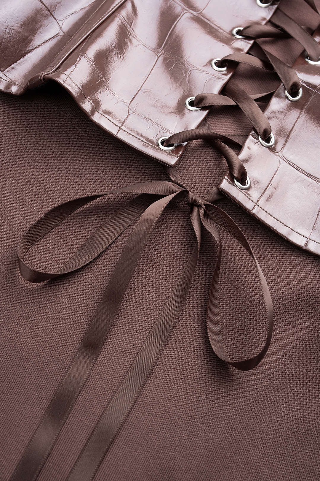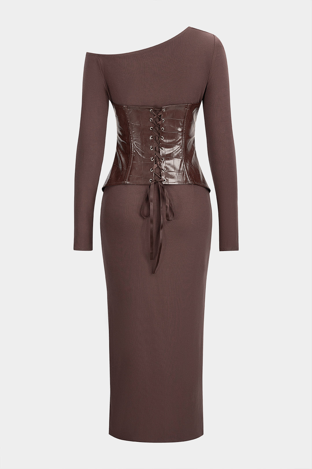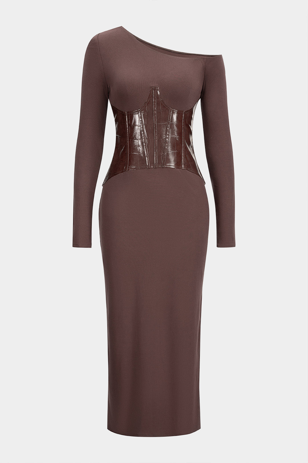 Faux Leather Patchwork One Shoulder Tie-Back Long Sleeve Maxi Dress