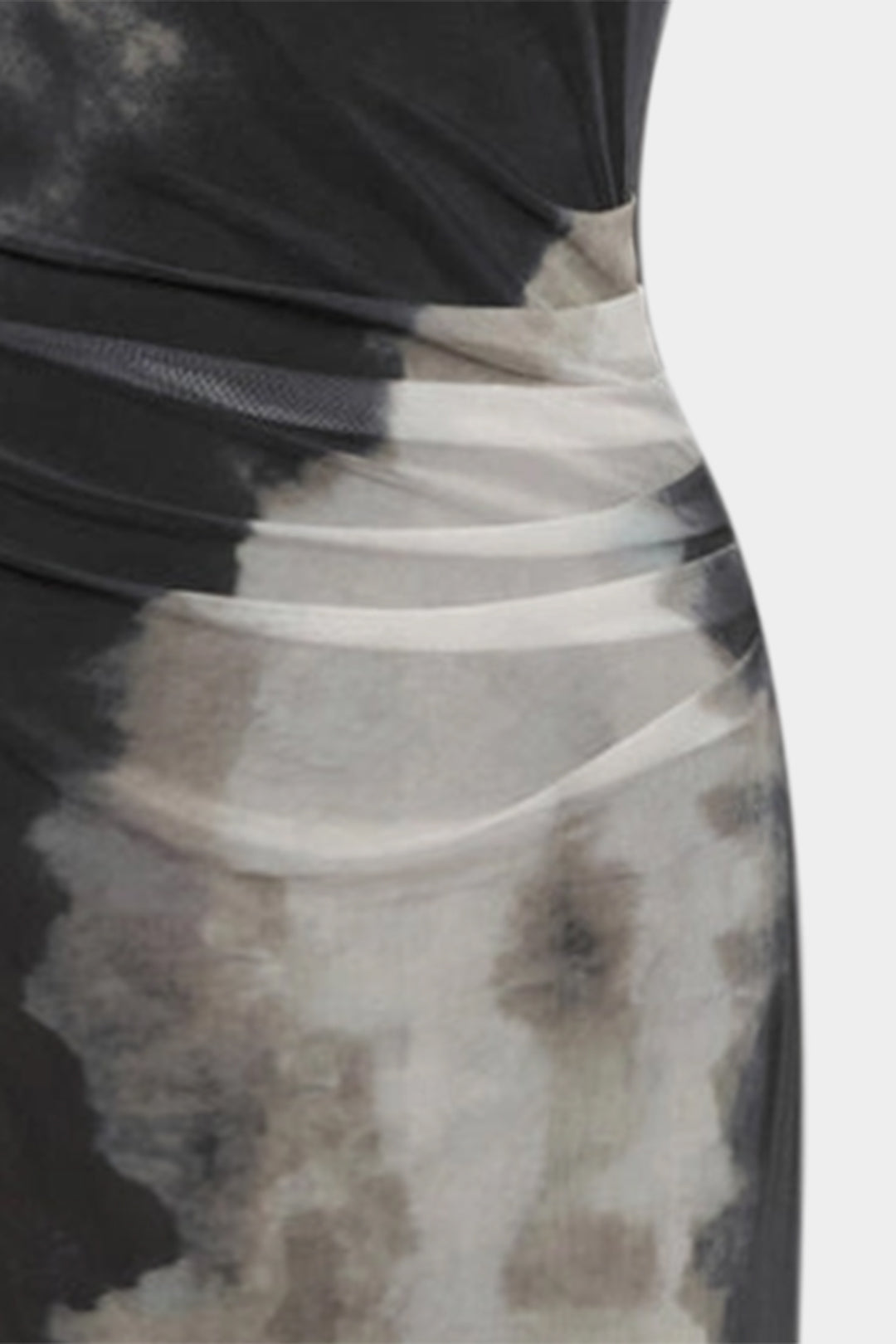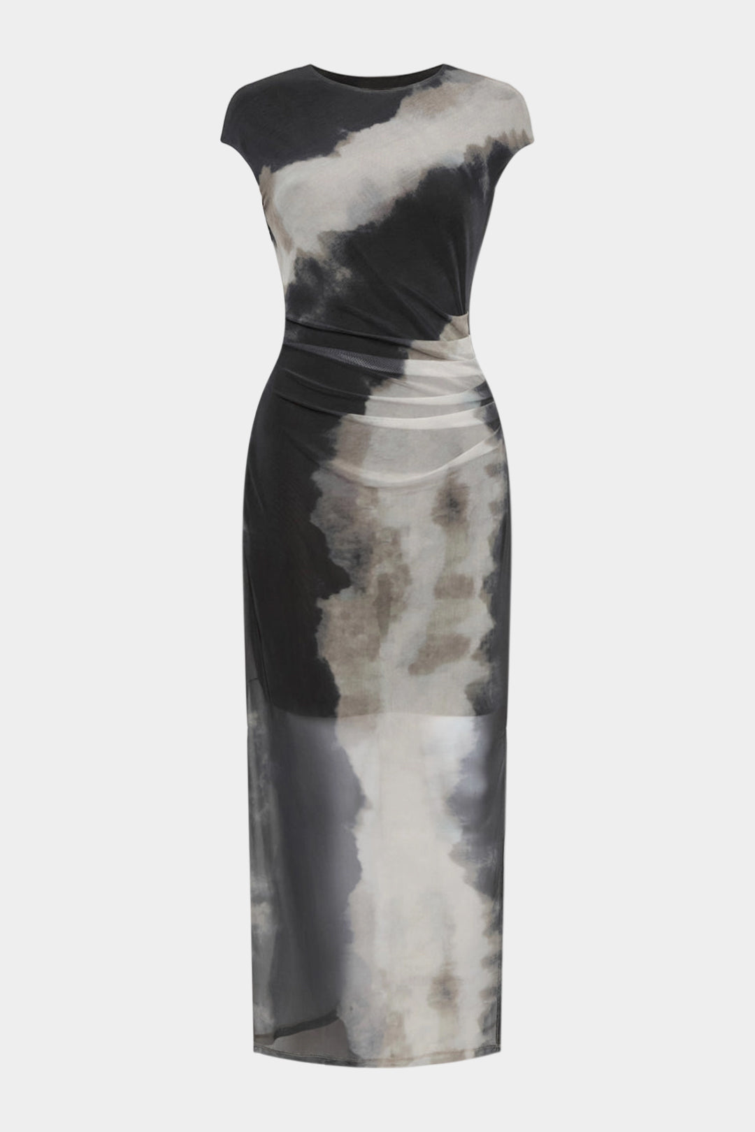 Contrast Abstract Print Mesh Pleated Asymmetrical Short-Sleeve Maxi Dress