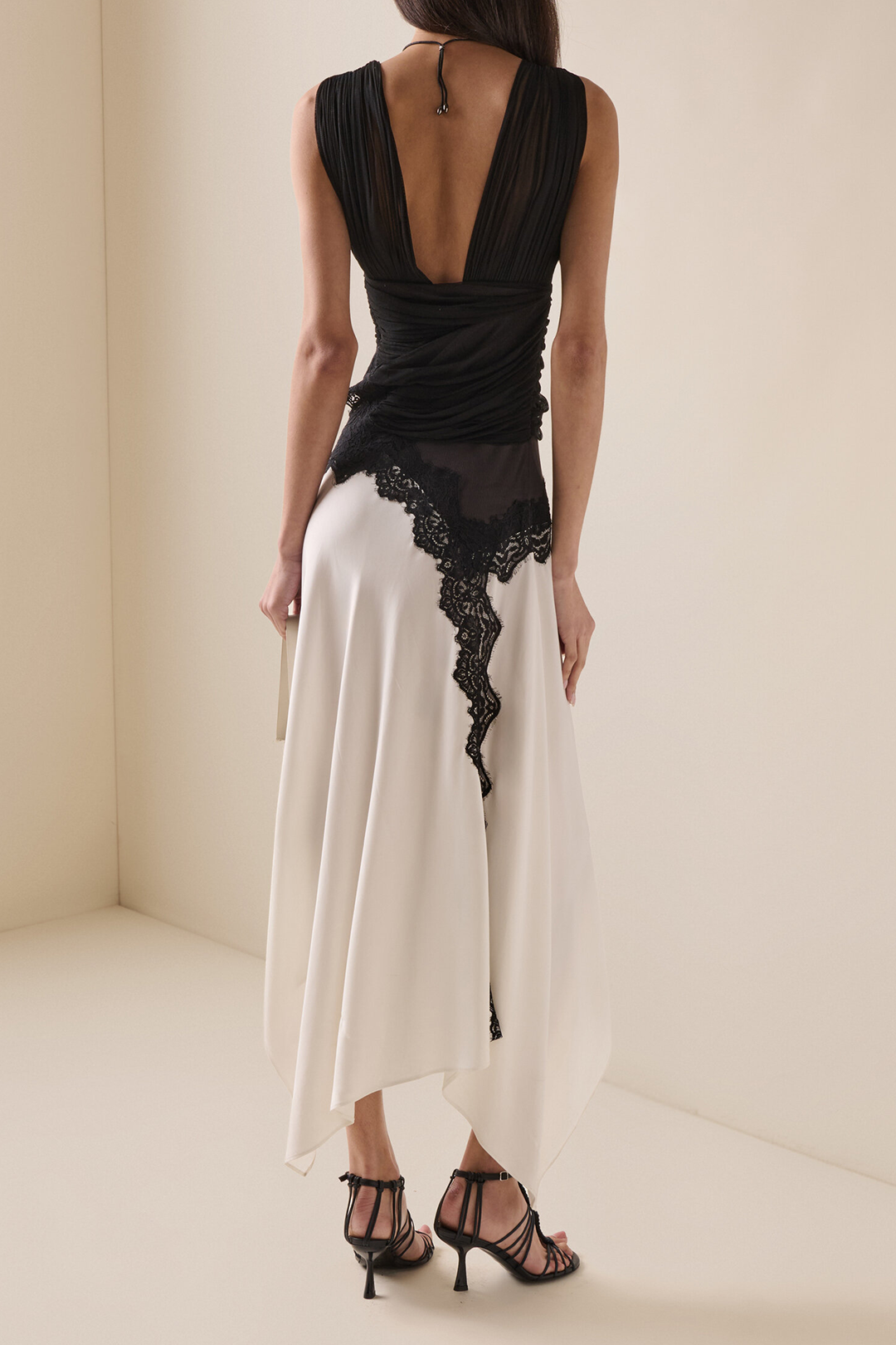 Lace Trim Sheer Patchwork Satin Asymmetrical Sleeveless Midi Dress