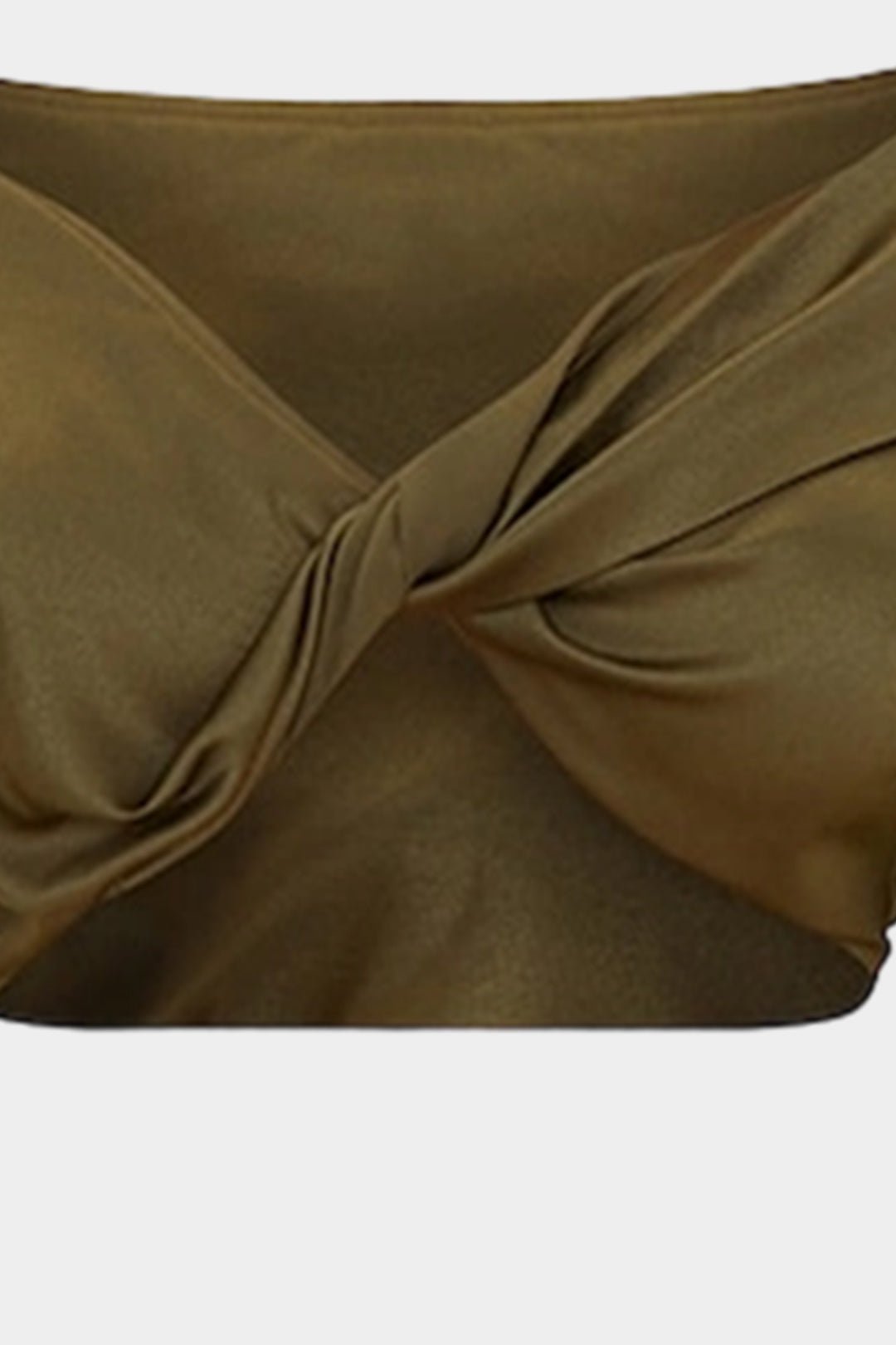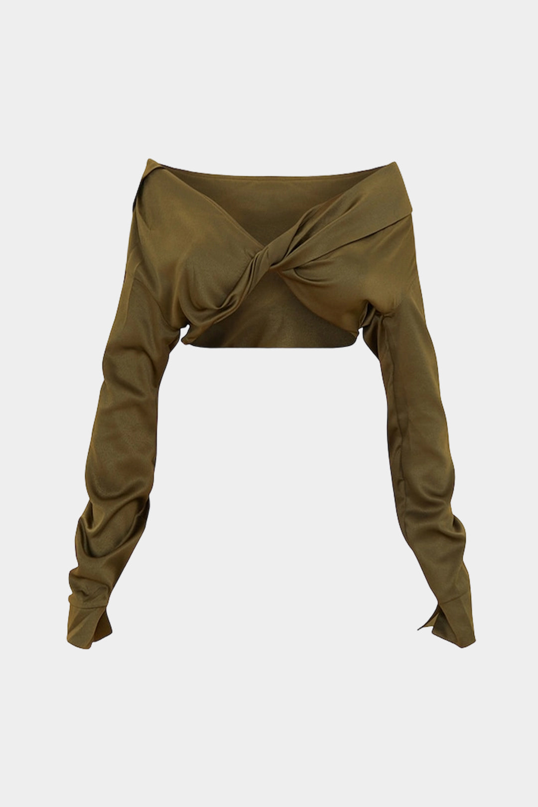 Satin Off Shoulder Twist Knot Long-Sleeve Cropped Shirt