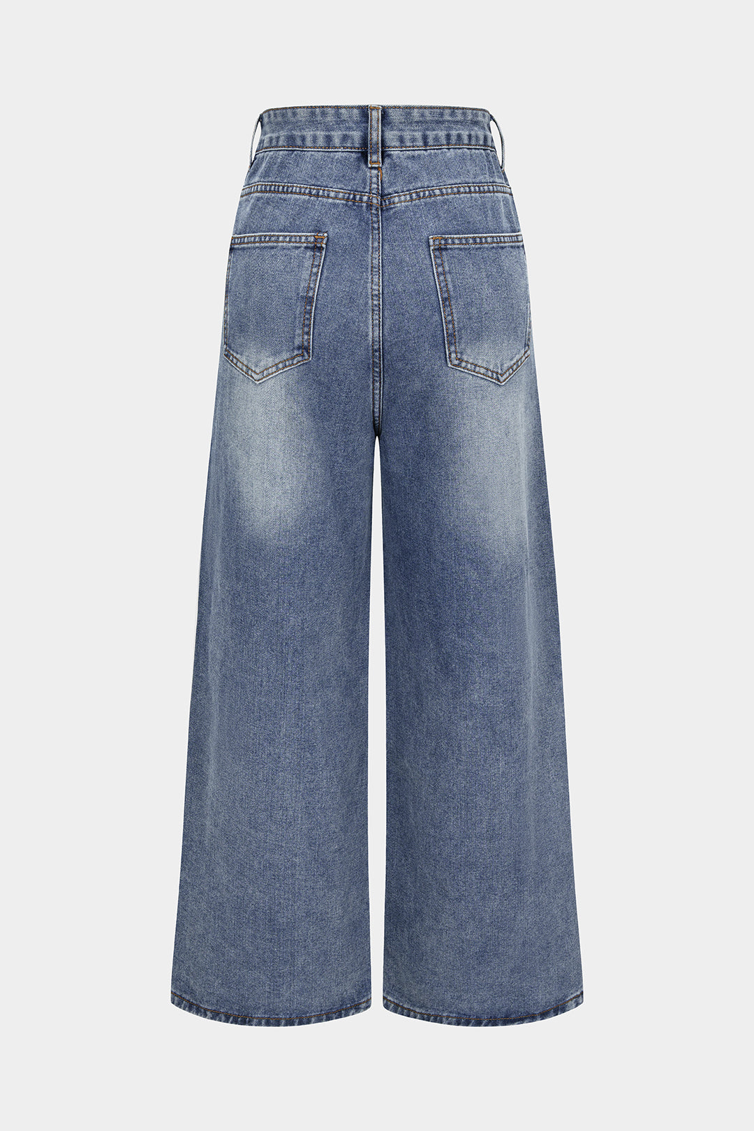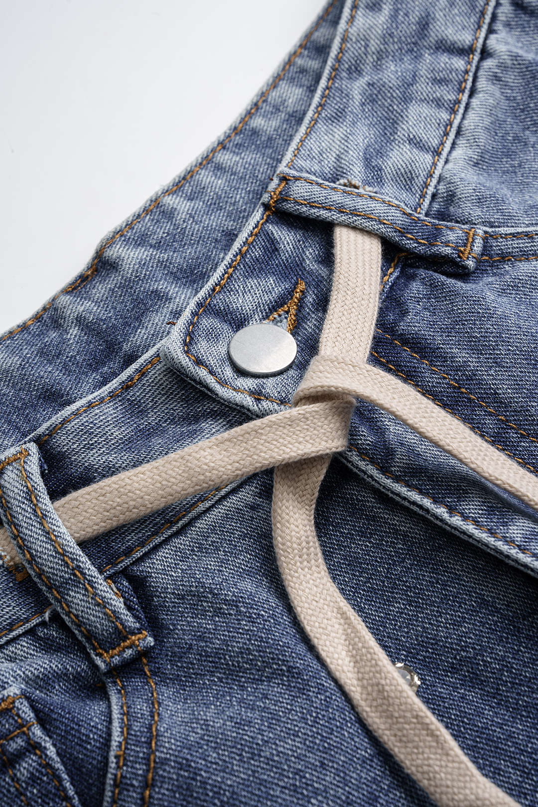 Denim Drawstring Beads Decor High Waist Wide Leg Jeans