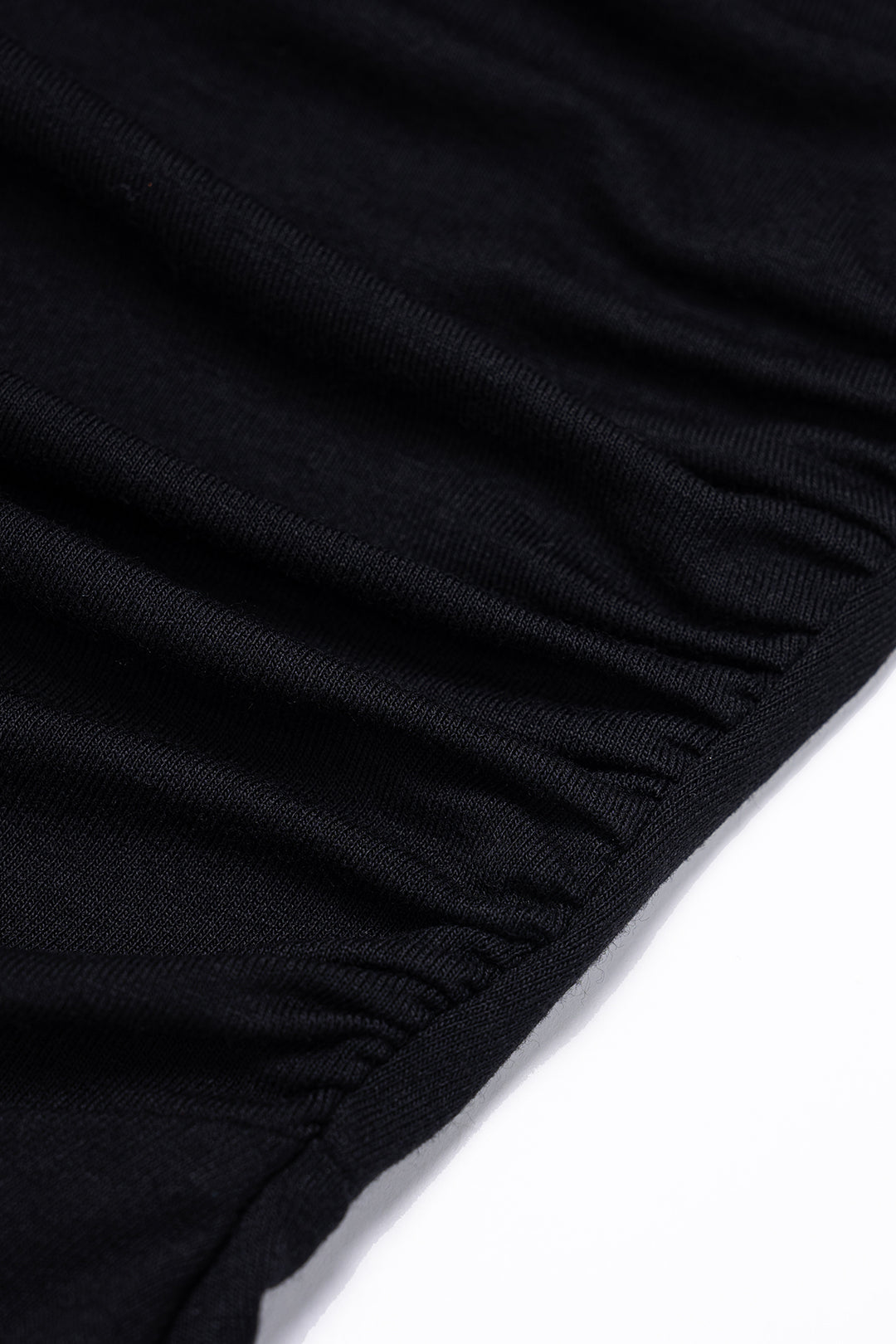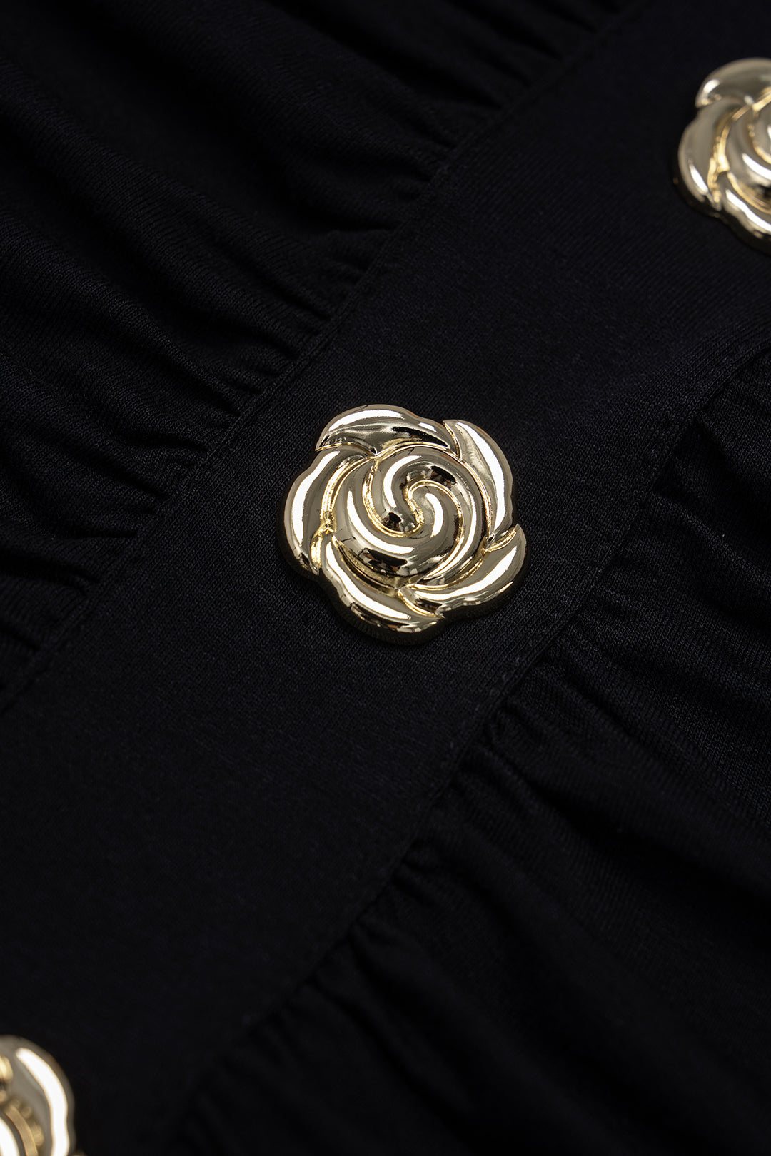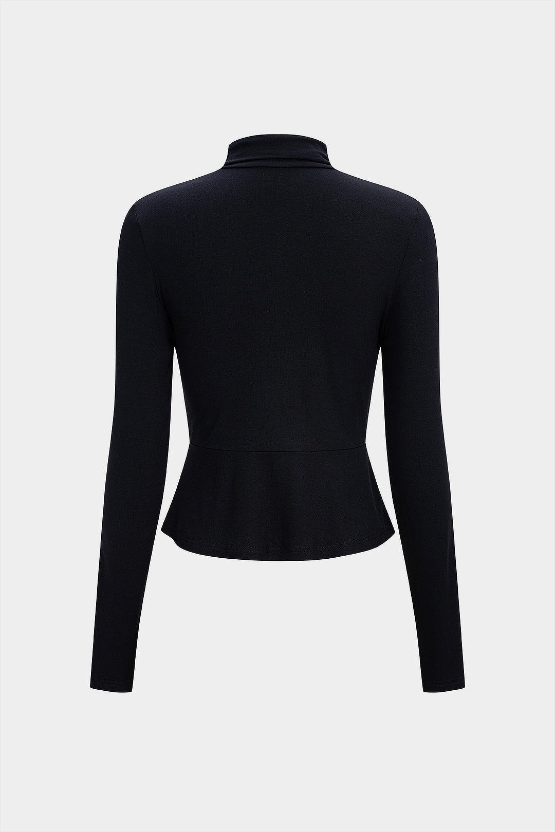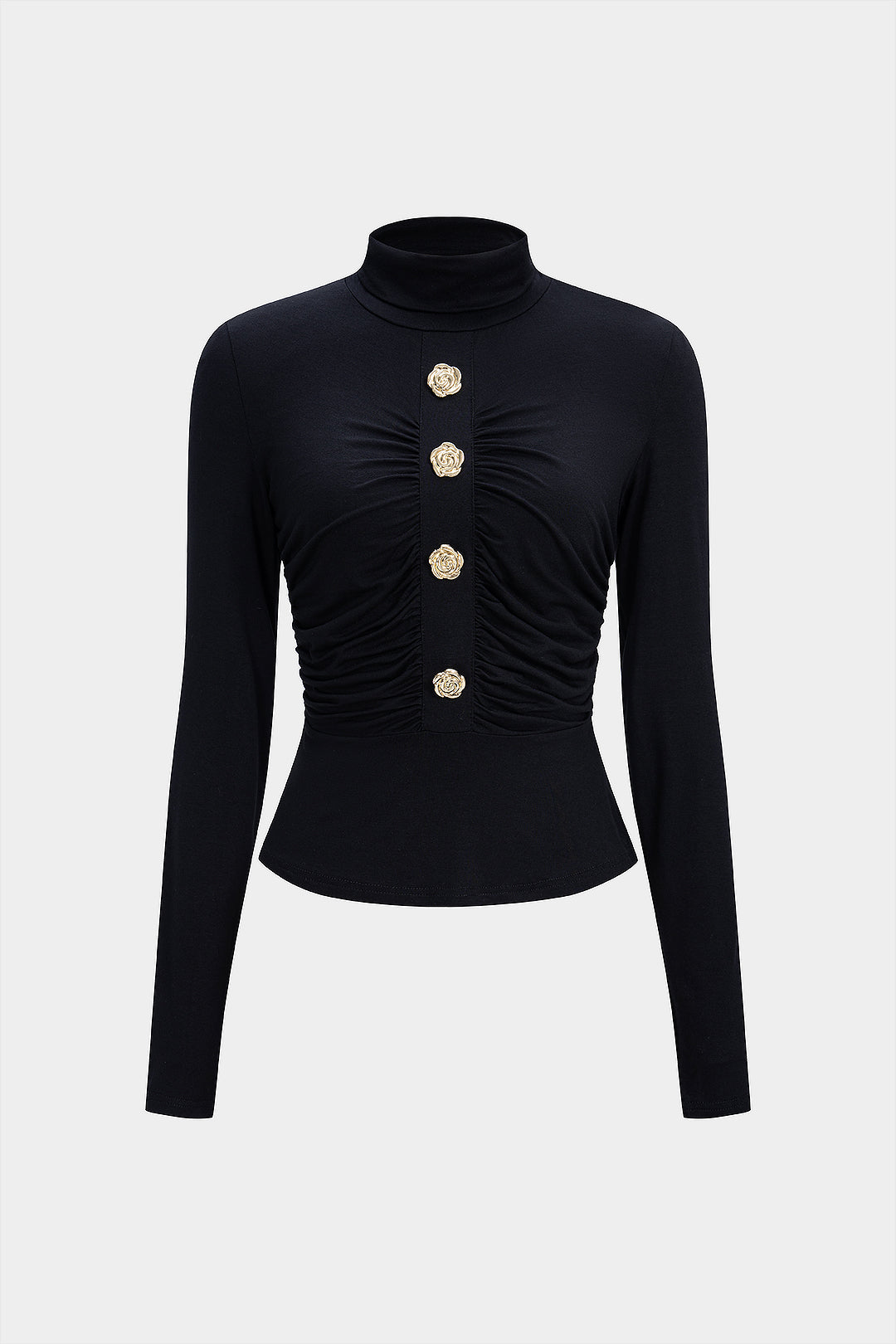 Metallic Button High Collar Ruched Long-Sleeve Top