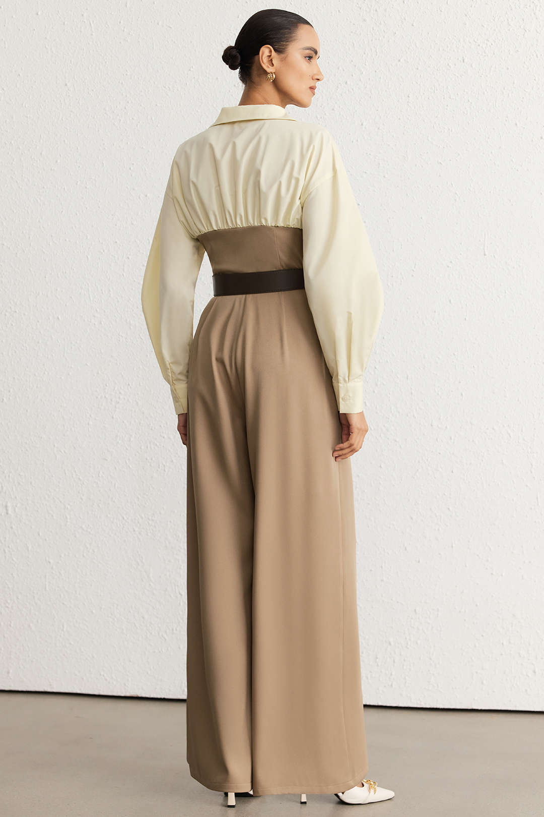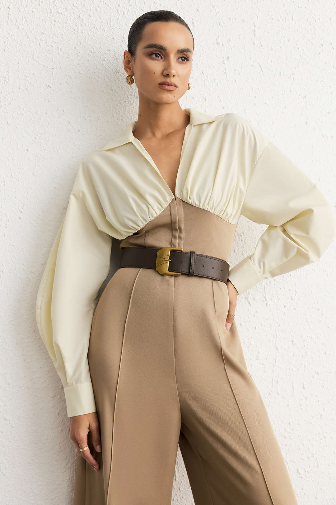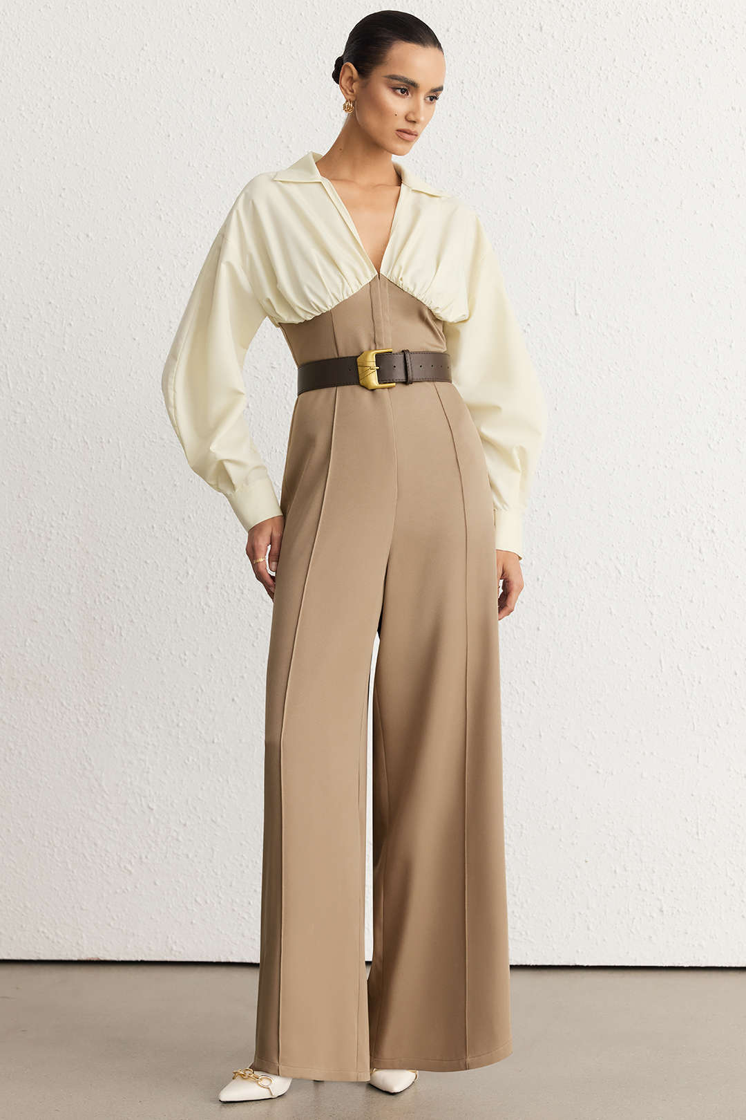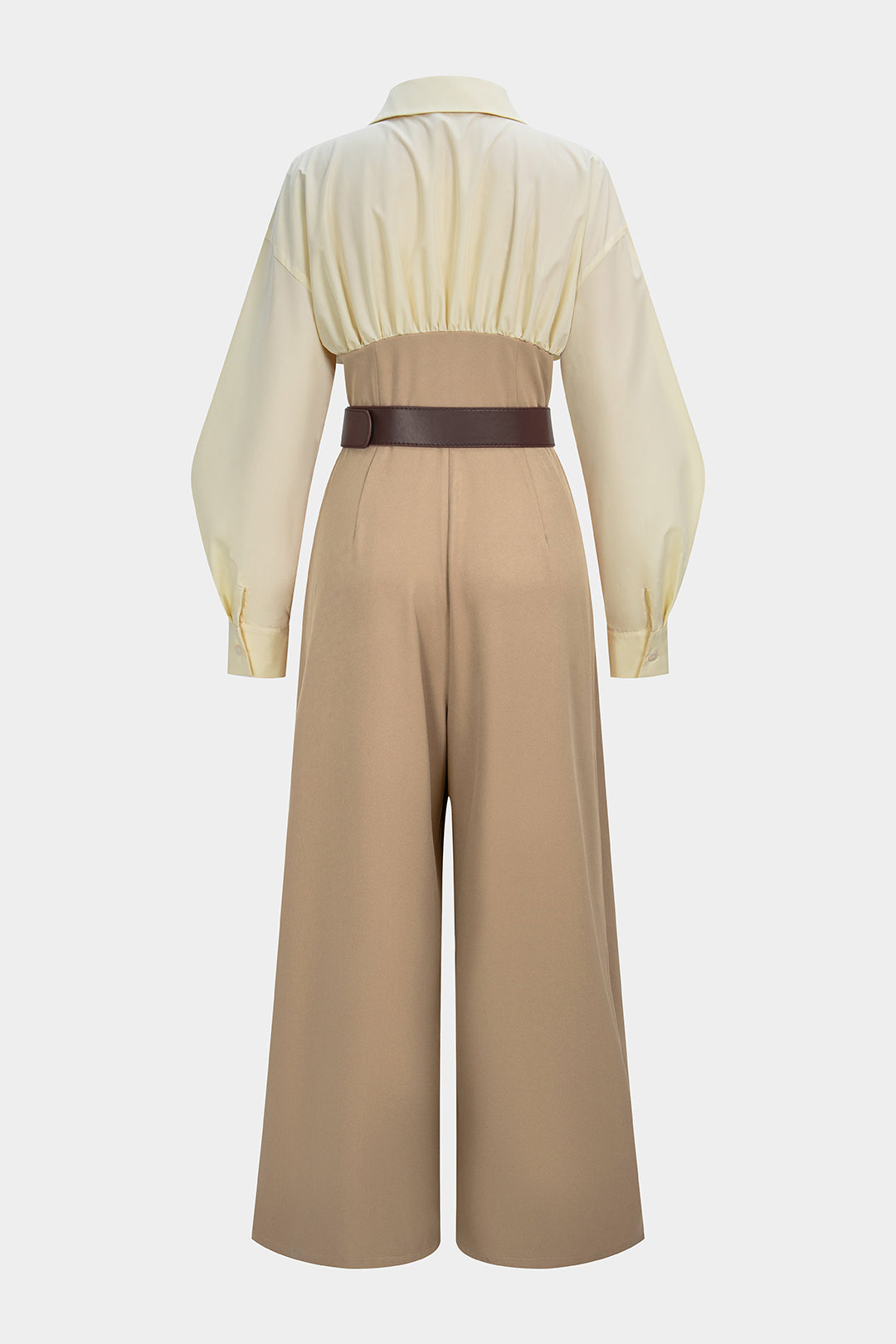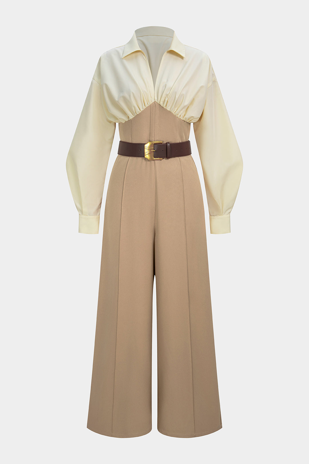 Patchwork Ruched V-Neck Belted Long Sleeve Jumpsuit