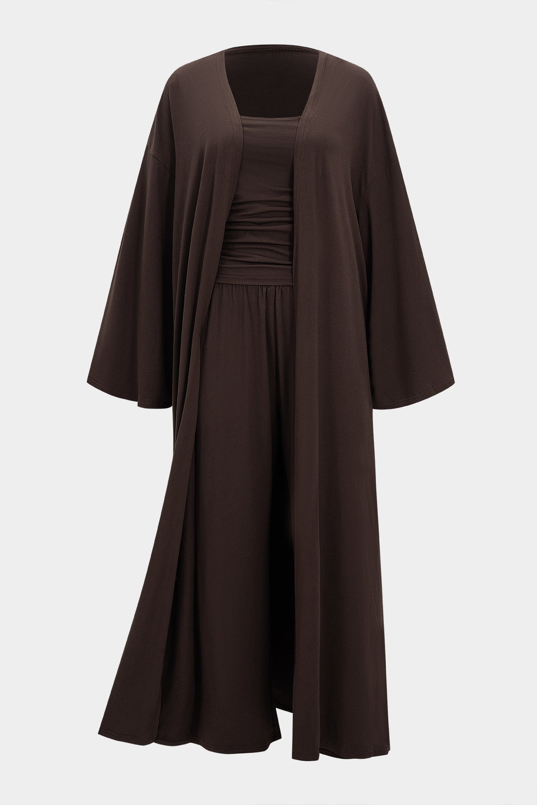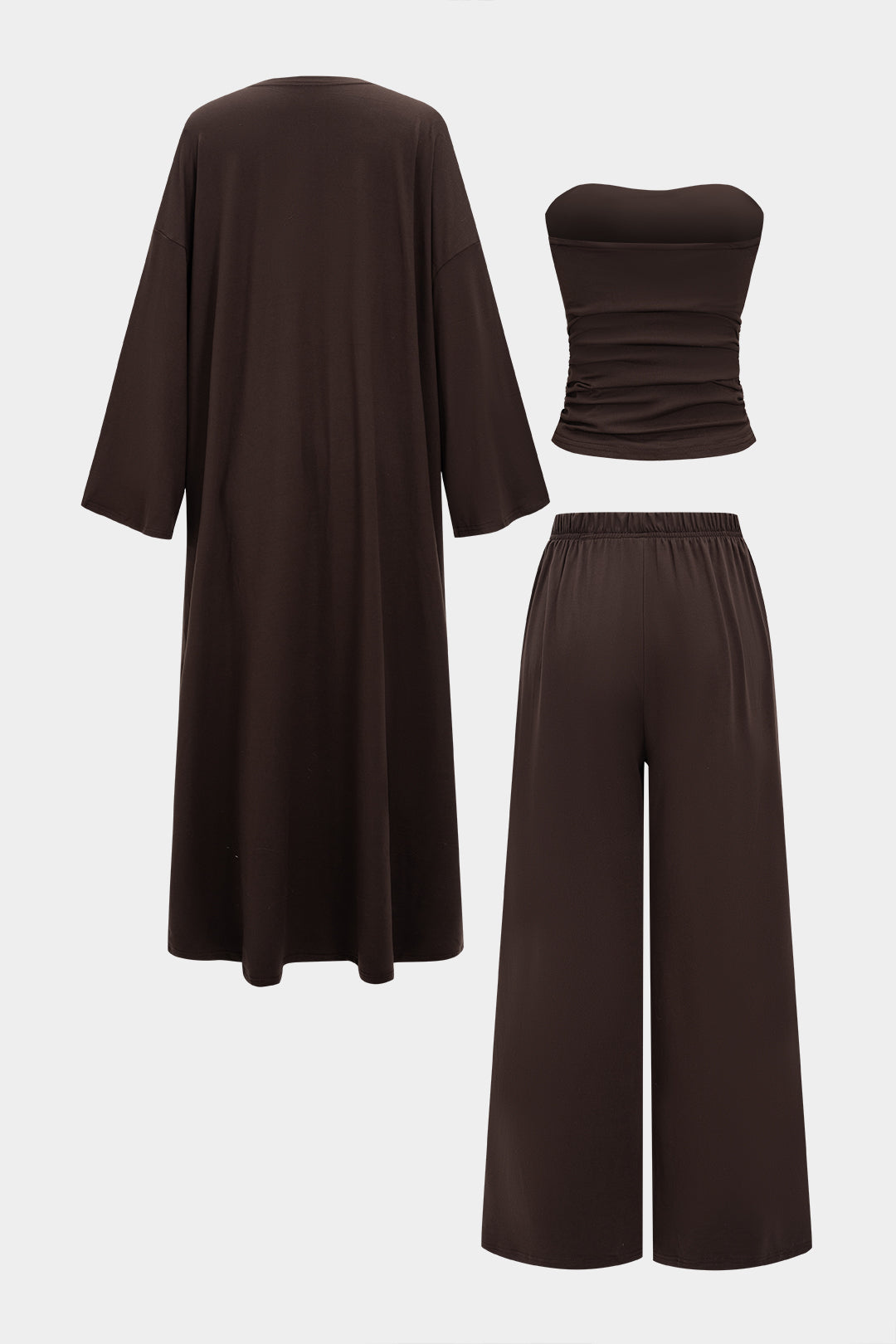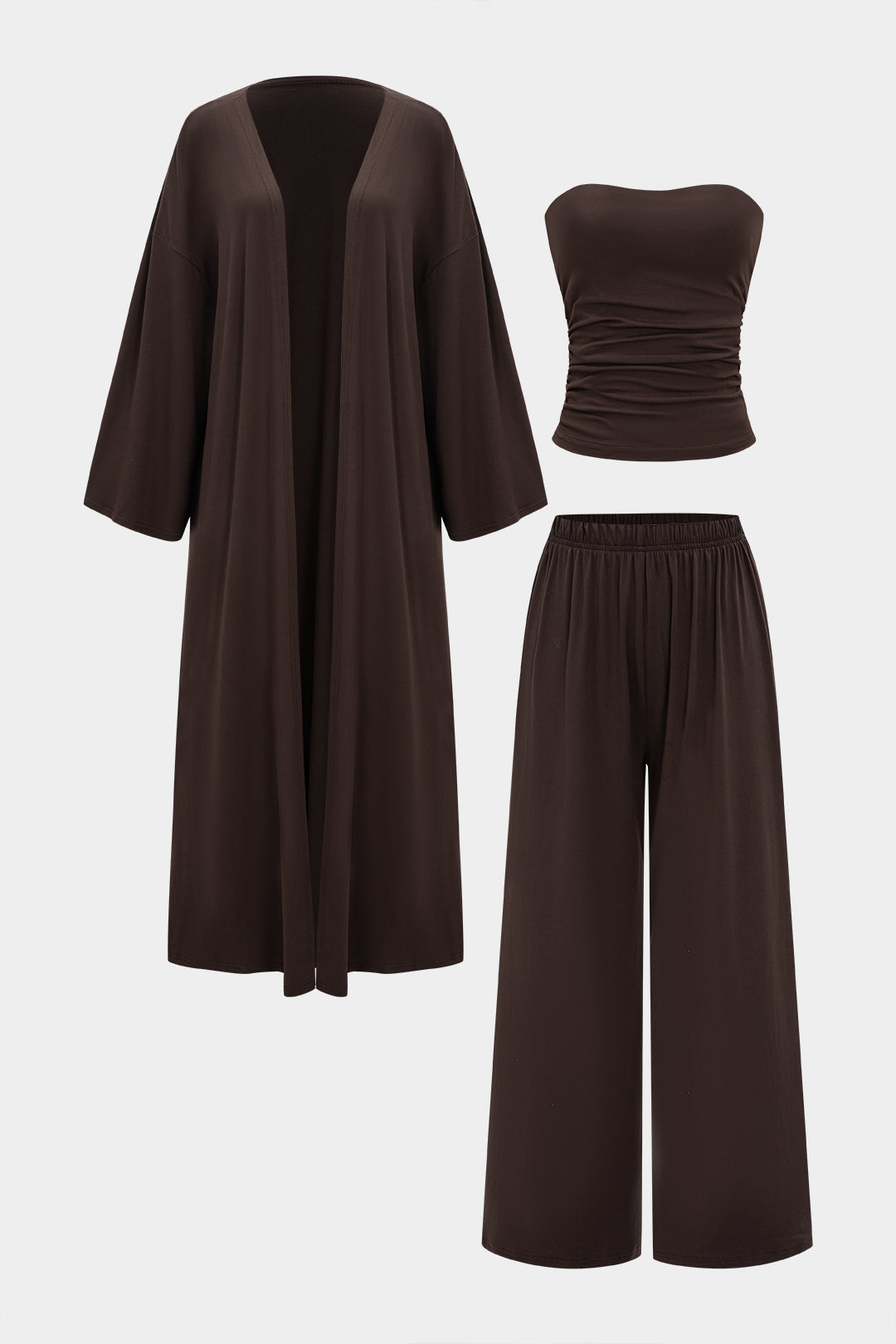 Solid Long Cardigan And Ruched Tube Top And Wide Leg Pants Set