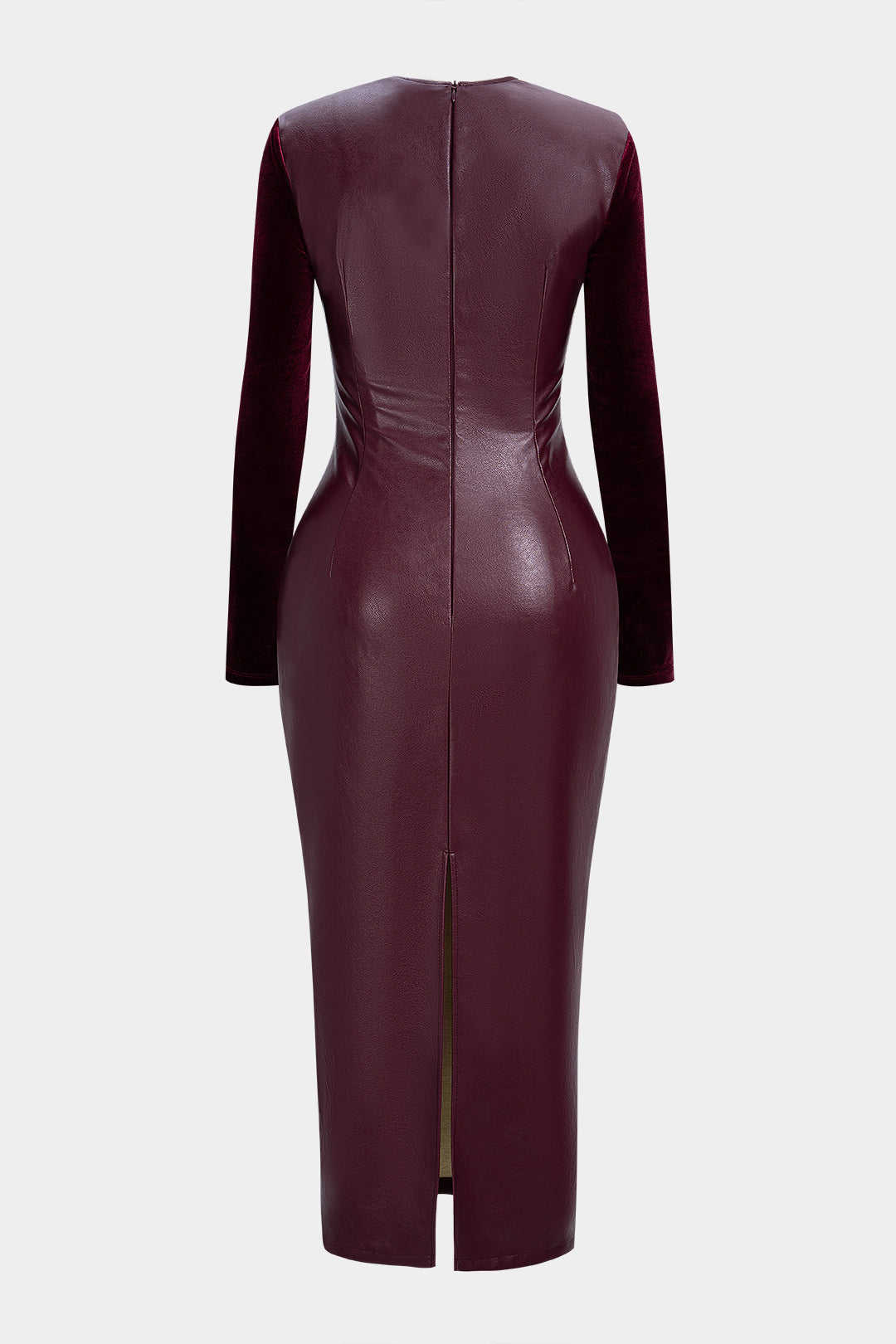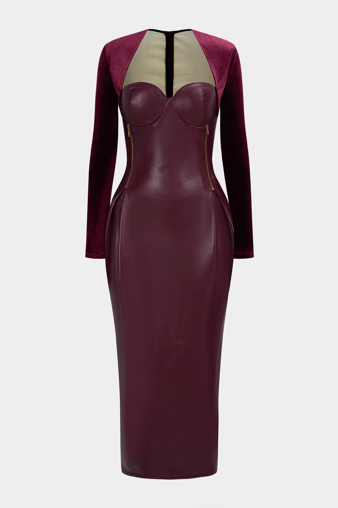 Faux Leather Patchwork Velvet Zipper Long Sleeve Midi Dress