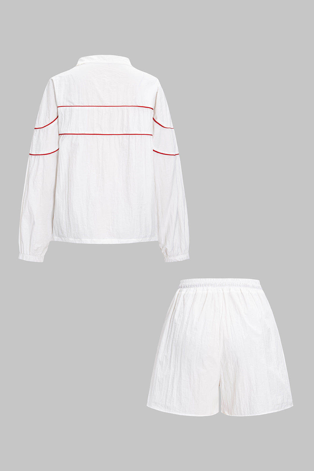 Contrast Binding Zipper Long-Sleeve Top And Tie-Up Wide Leg Shorts Set