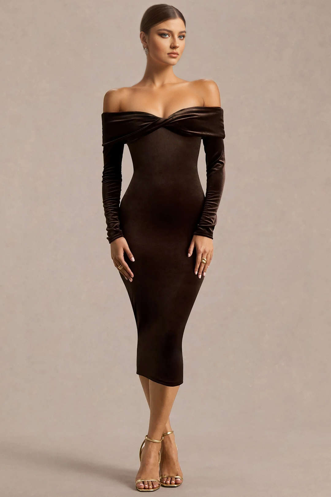 Velvet Patchwork Off Shoulder Long-Sleeve Midi Dress