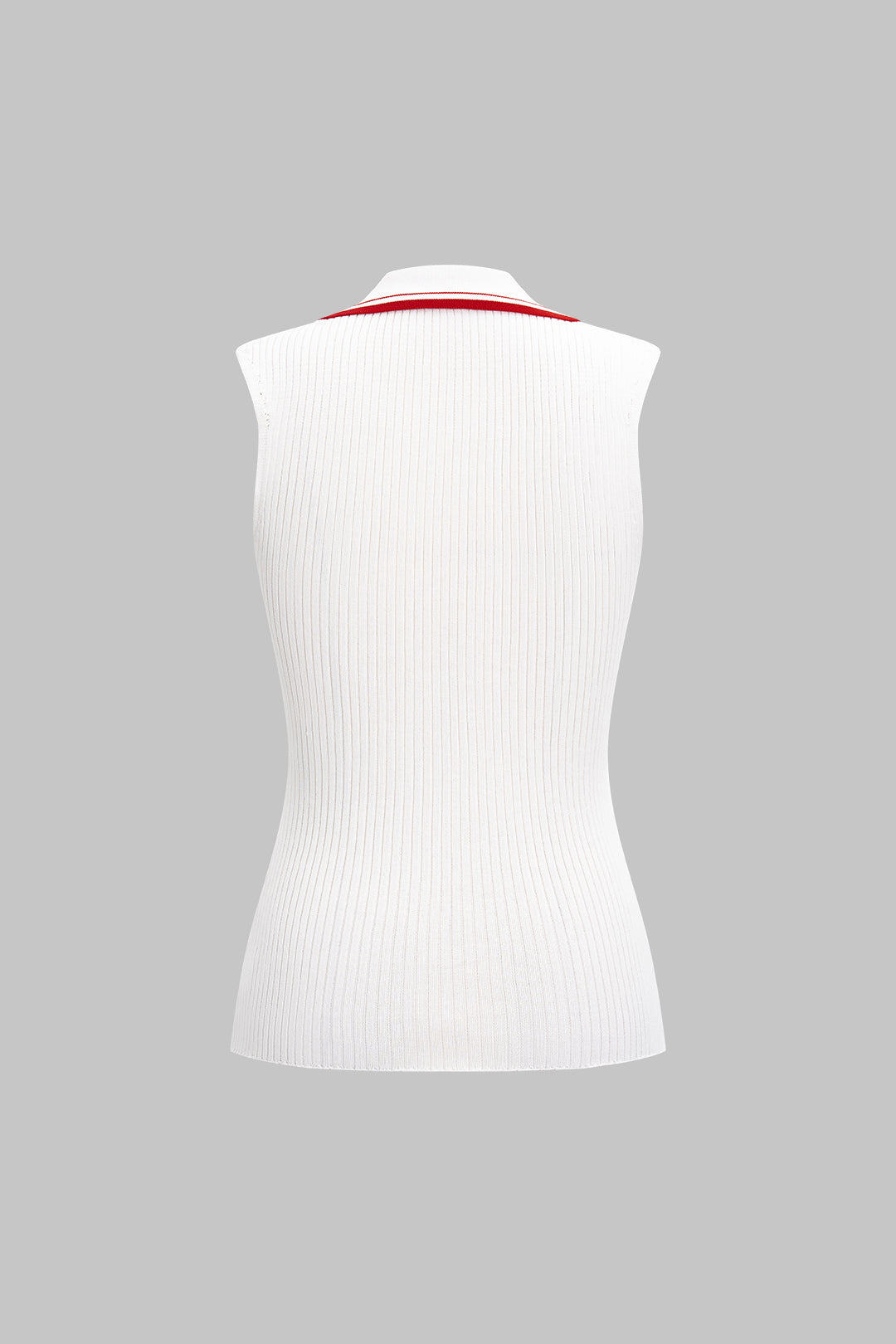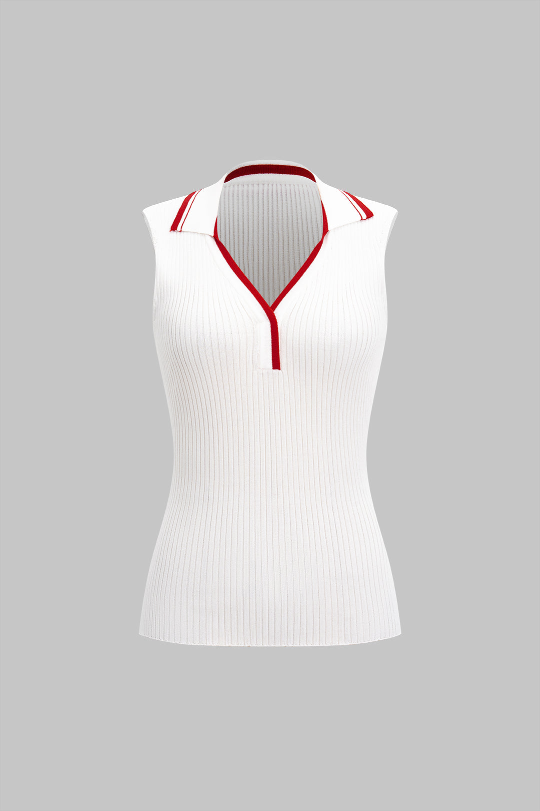 Knit Contrast Binding Polo Collar Ribbed Tank Top