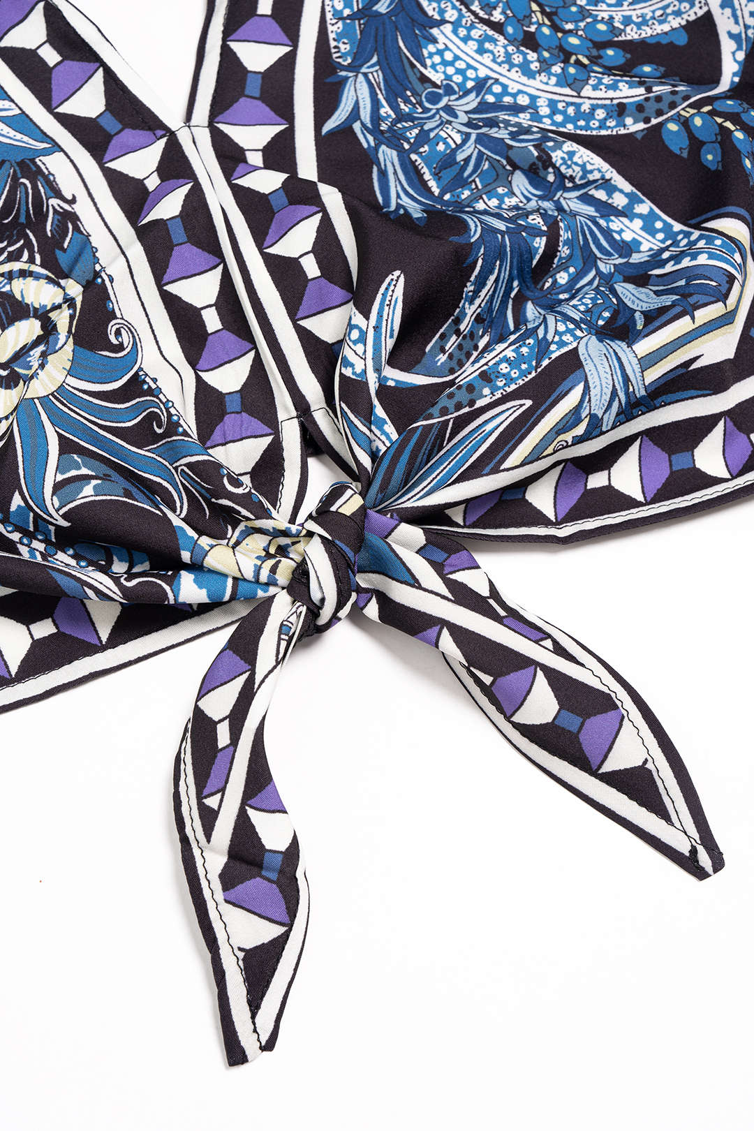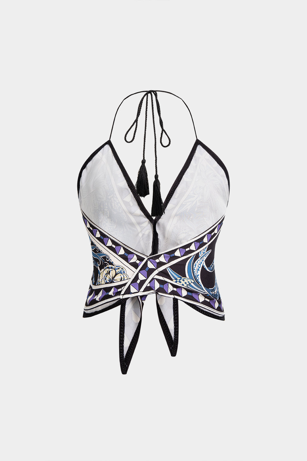 Geometric Leaves Print Halter V-Neck Tie-Up Cami Top