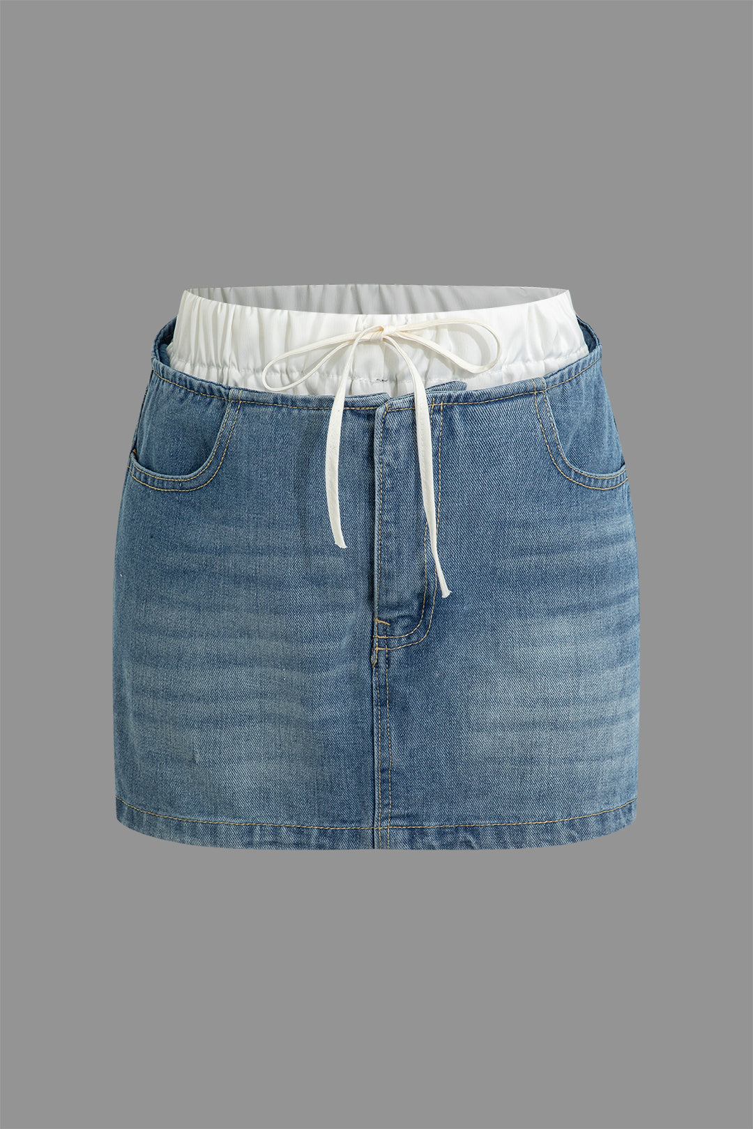 Denim Double Waistband Shirred Washed Pocket Zipper Skirt