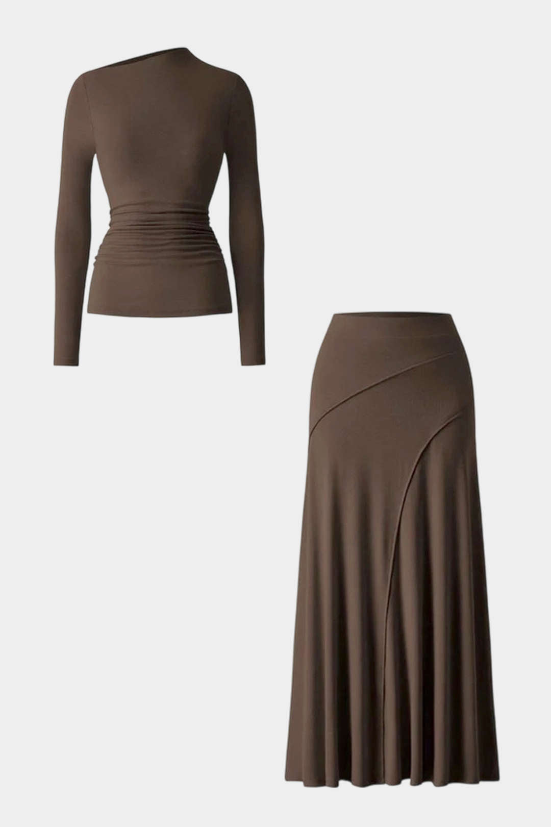 Asymmetrical Neck Long-Sleeve Top And Stitching Detail Skirt Set