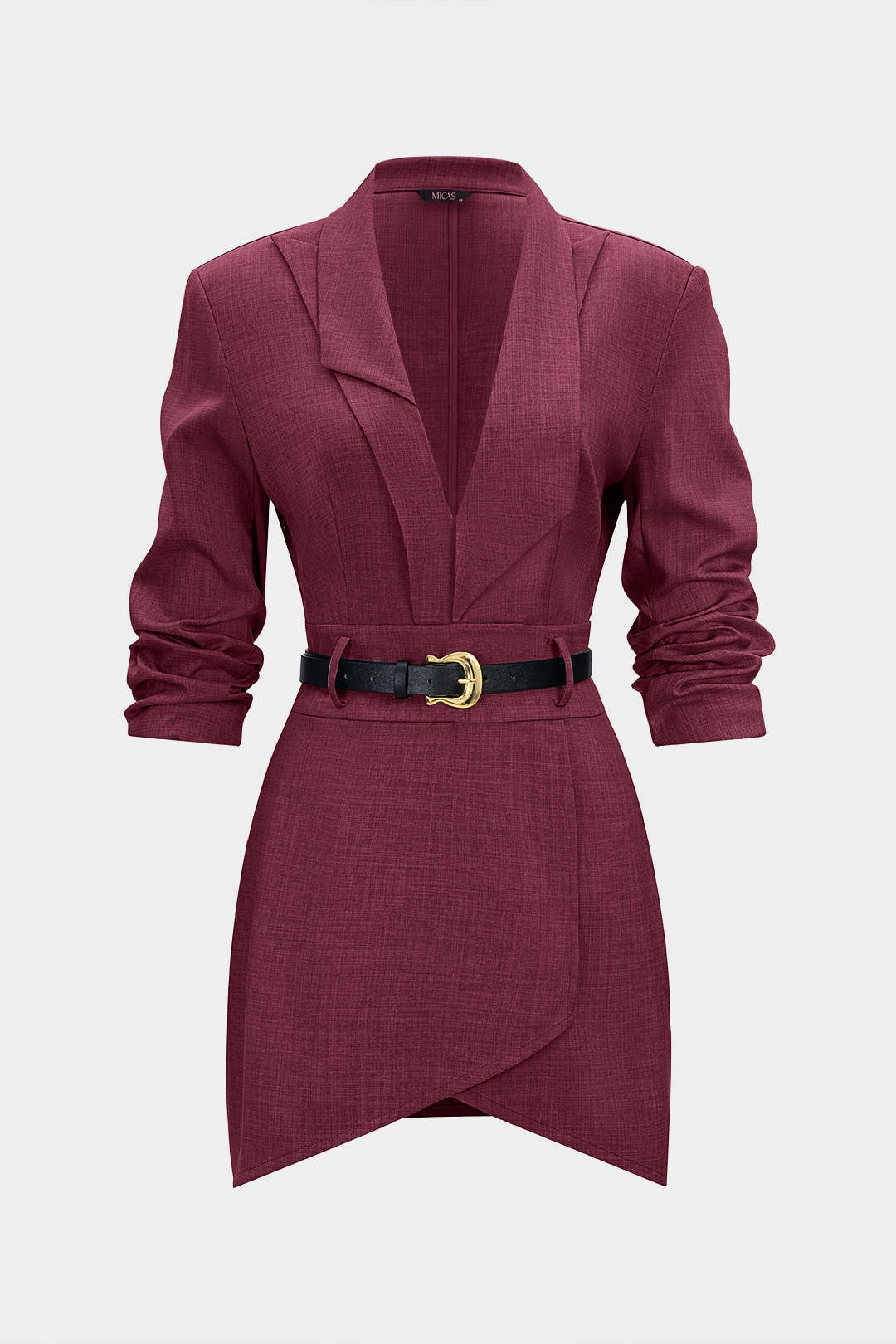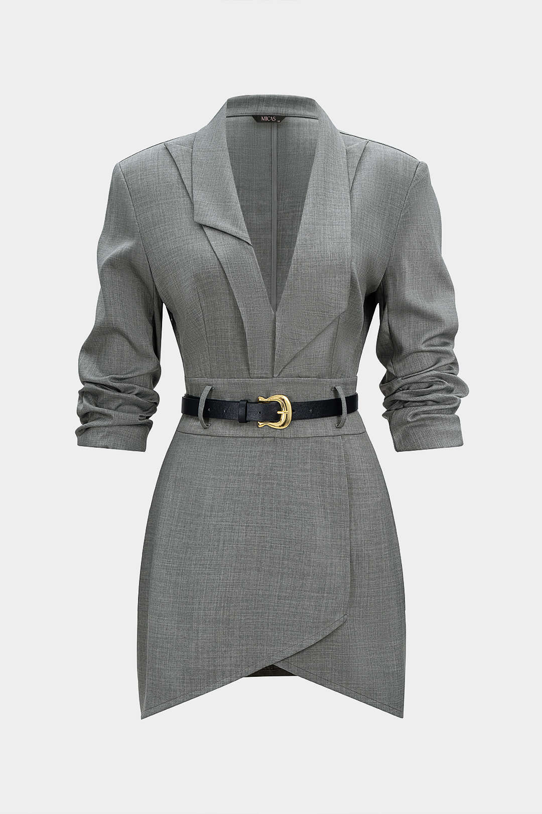 Asymmetrical Notched Lapel Belted Long Sleeve Mini Dress