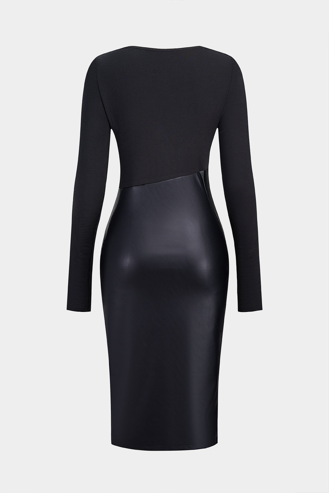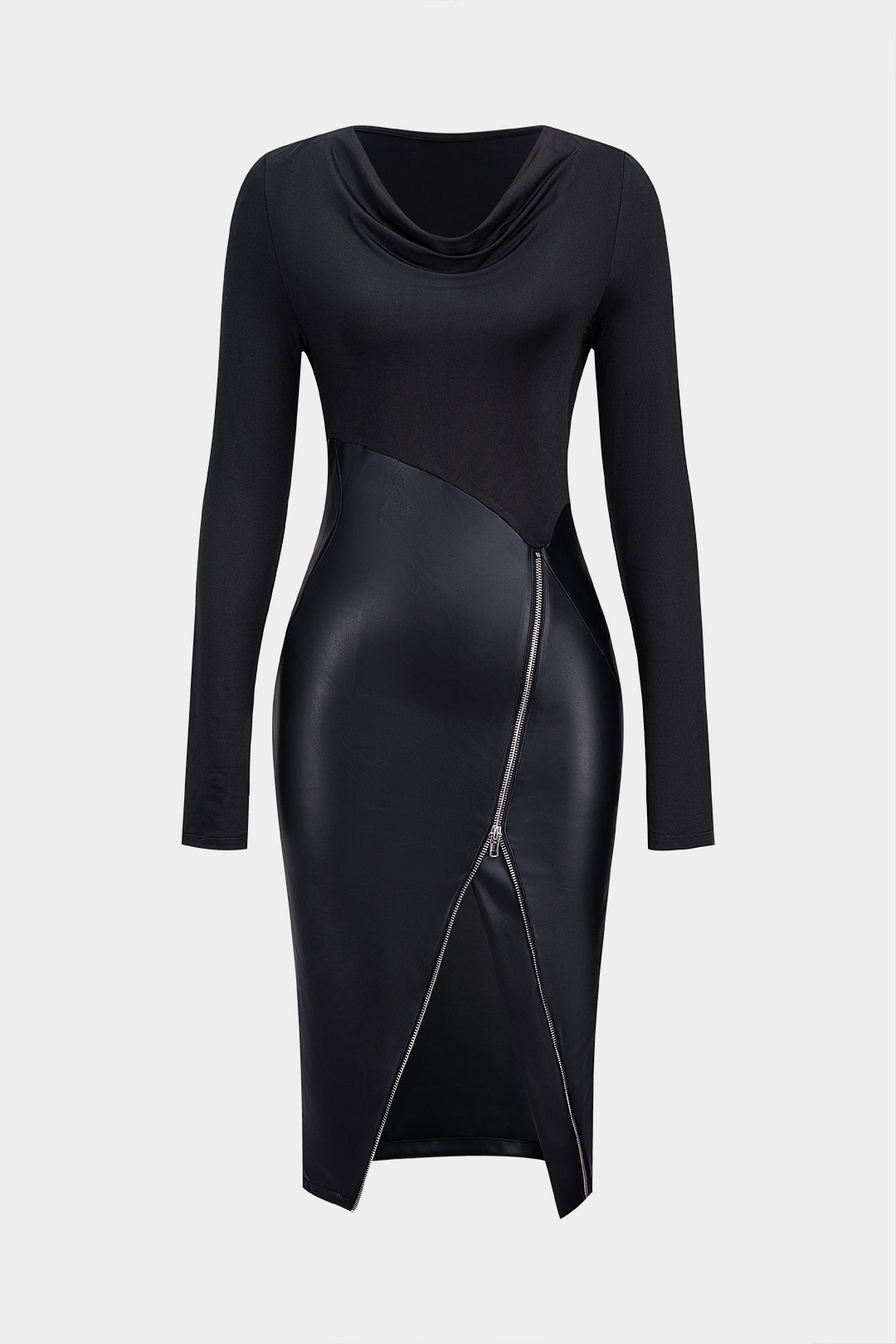Faux Leather Cowl Neck Zipper Ruched Asymmetrical Long Sleeve Midi Dress