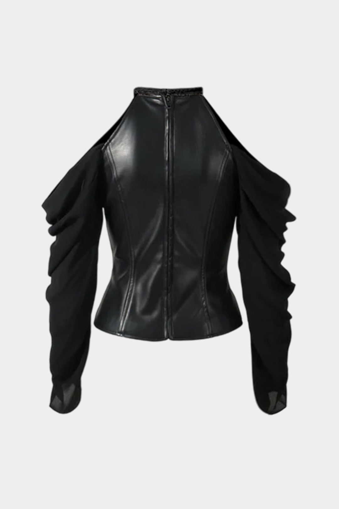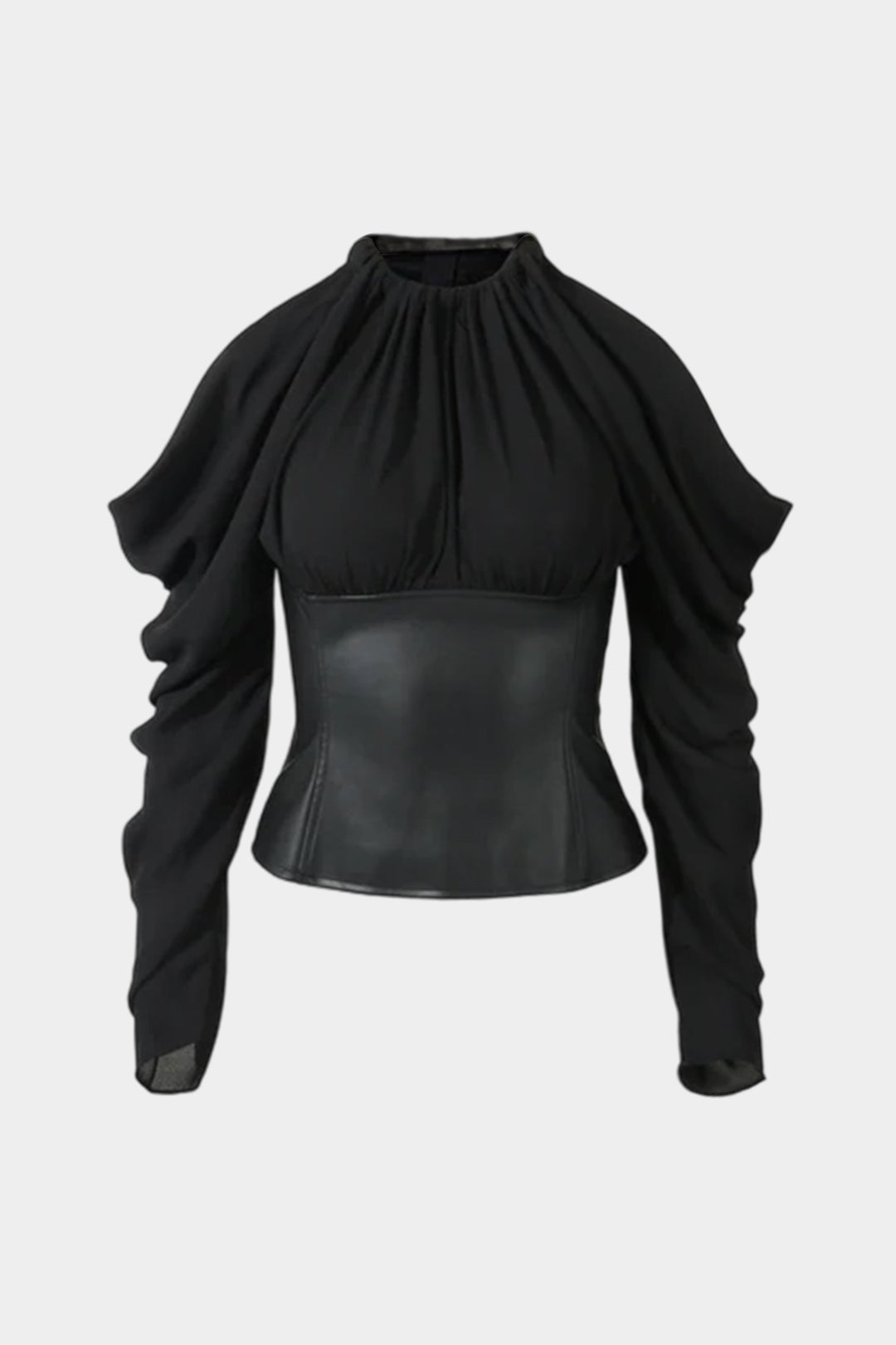 Chiffon Patchwork Faux Leather Ruched Long-Sleeve Shirt