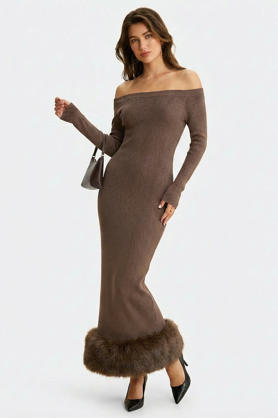 Feather Trim Off Shoulder Long Sleeve Maxi Dress