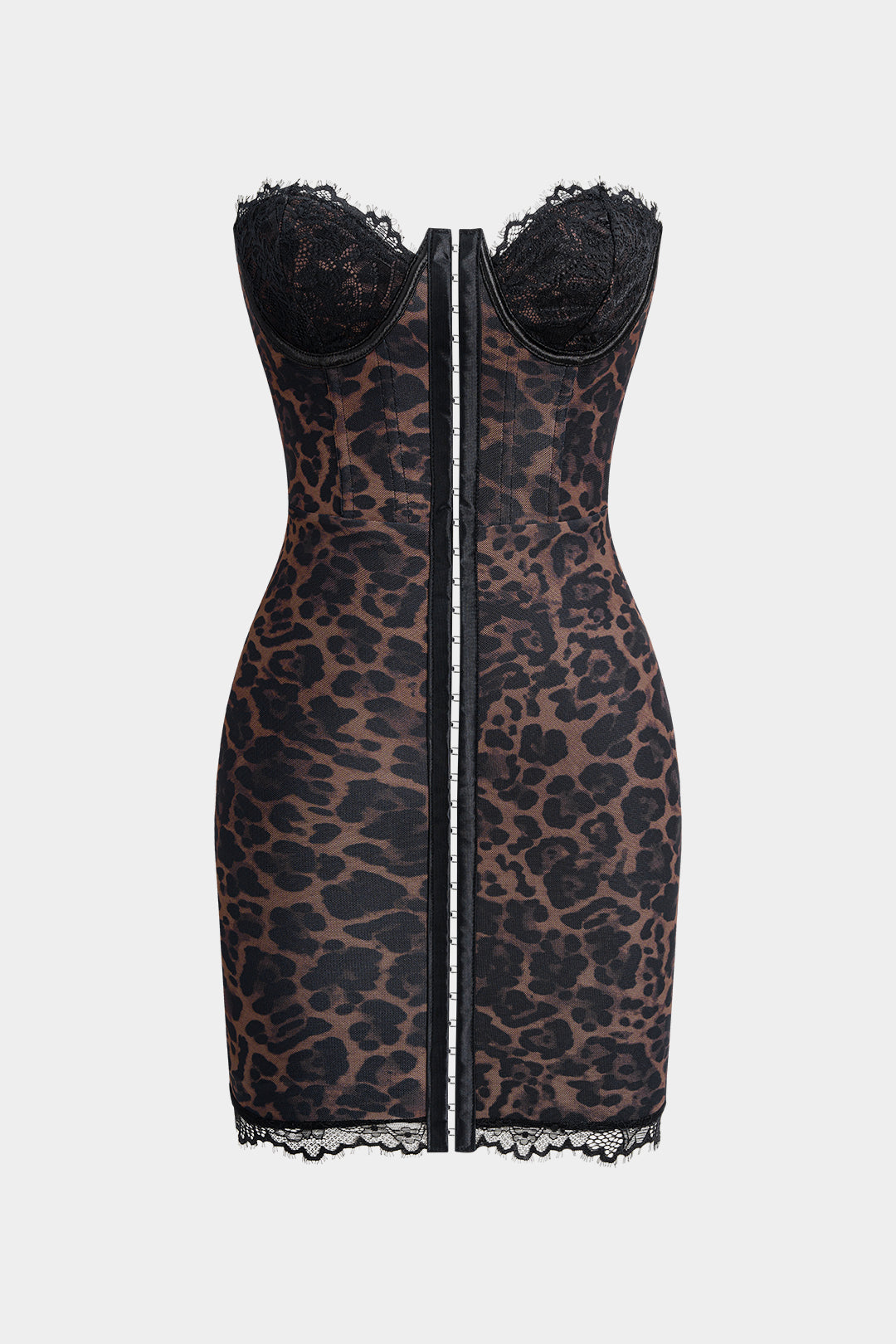Leopard Print Patchwork Wrap Strapless Sleeveless Mini Dress