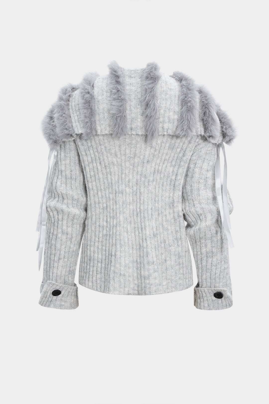 Knit Faux Fur Patchwork Button Tie-Up Cardigan