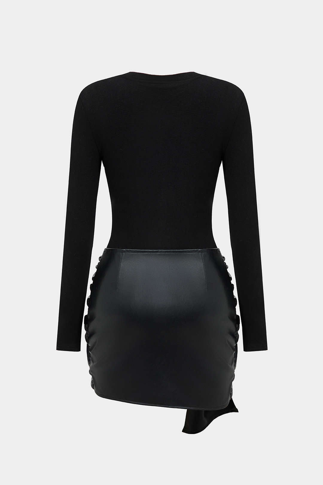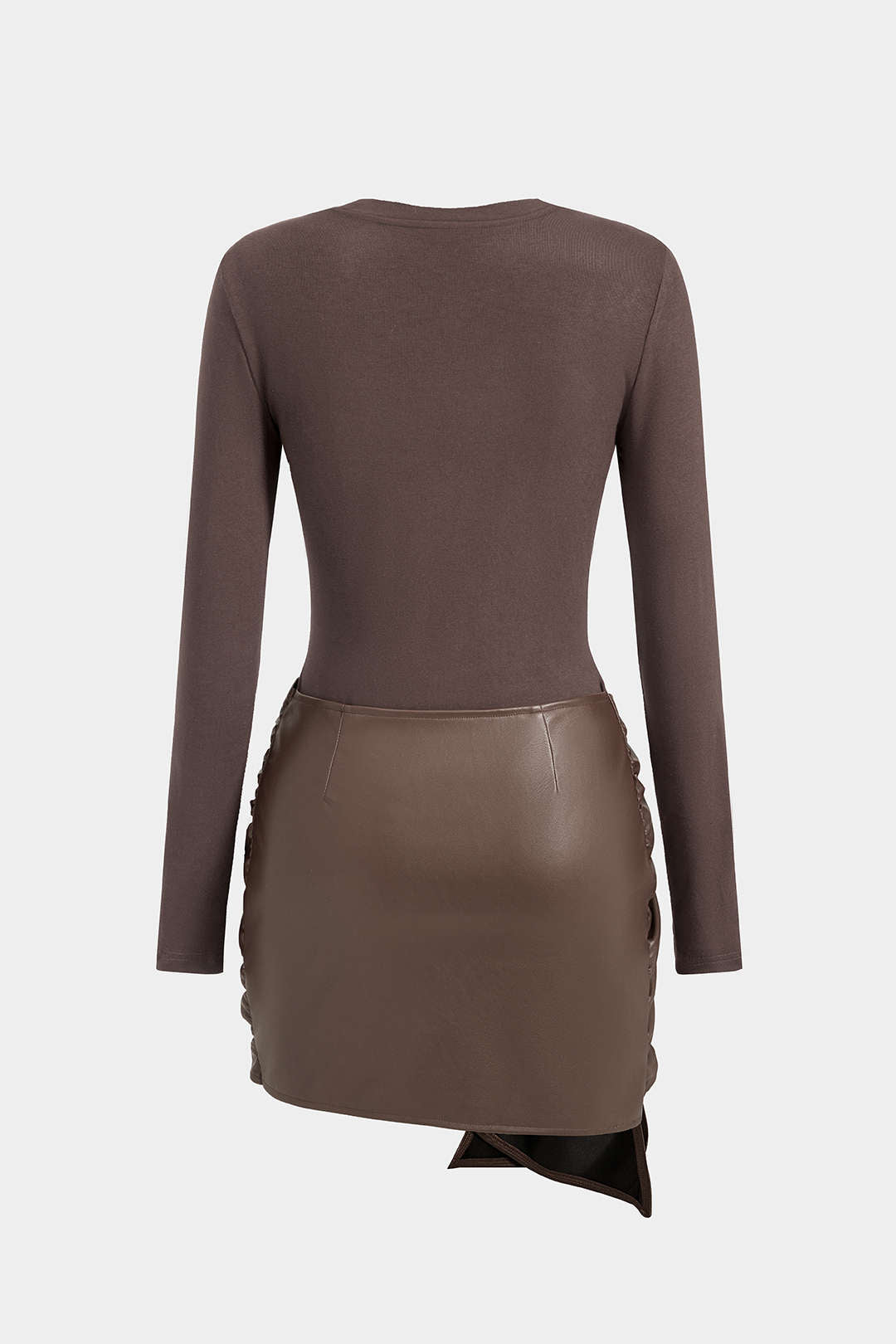 Faux Leather Patchwork Tie Front Round Neck Ruched Mini Dress
