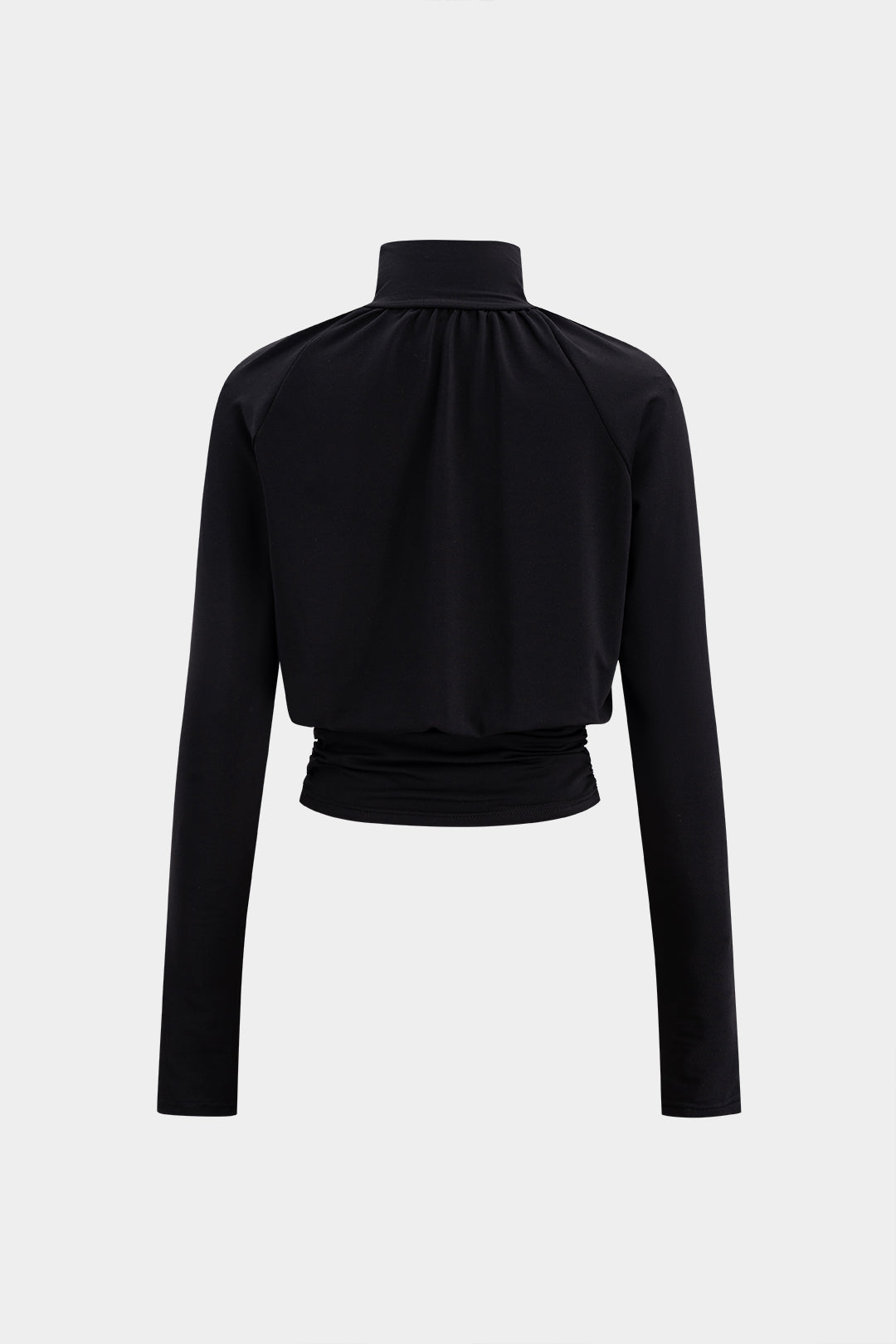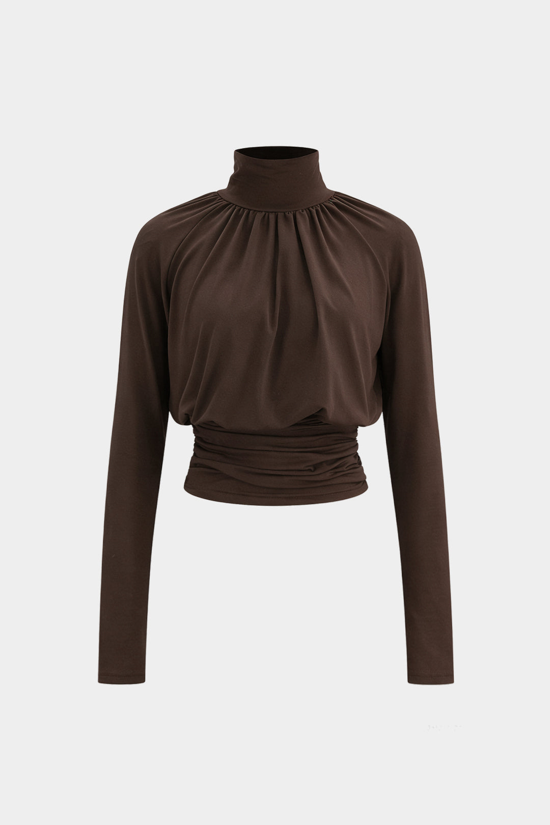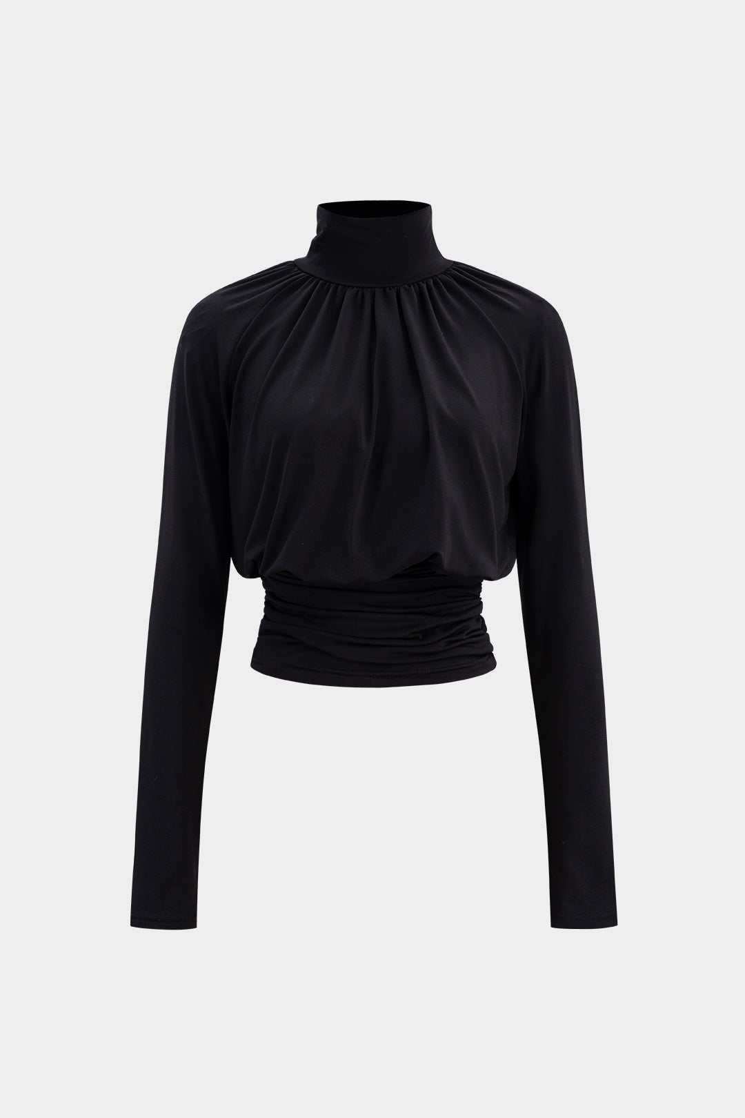 Basic Faux Leather High Collar Wrinkled Long Sleeve T-Shirt