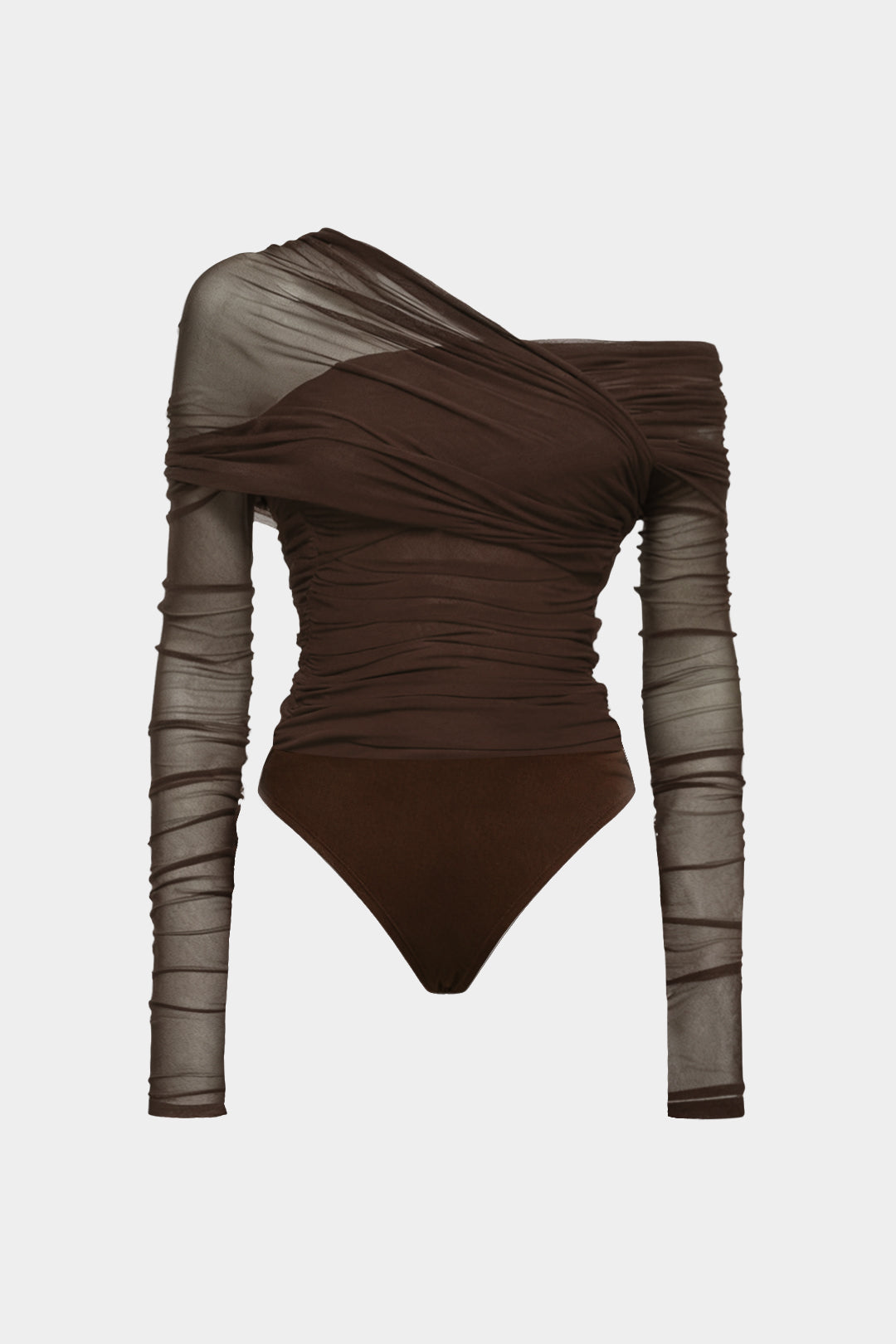 Mesh Ruched One Shoulder Asymmetrical Corssed Ruched Bodysuit
