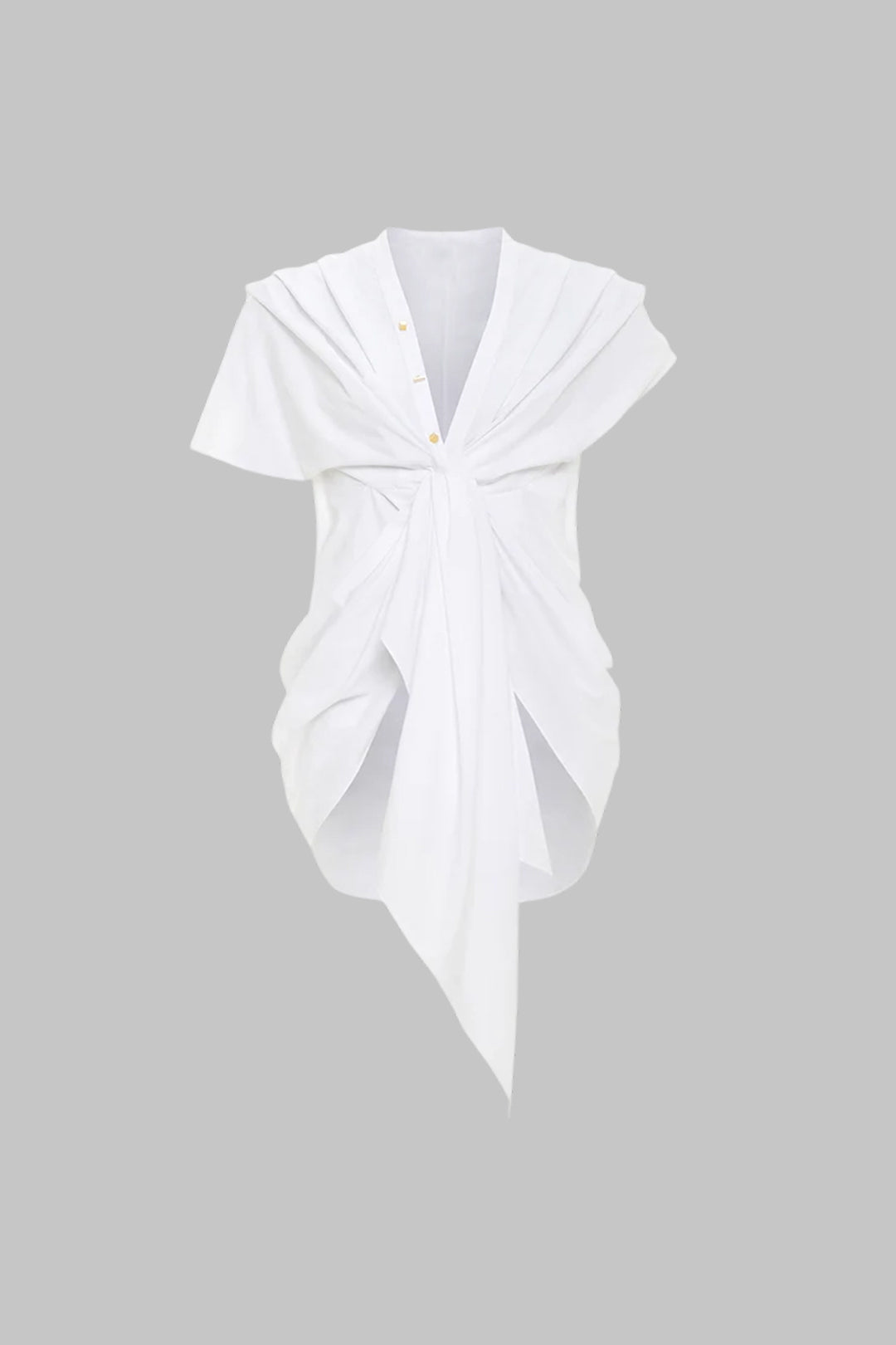 Ruched Tie-Up V-Neck Asymmetrical Short-Sleeve Shirt