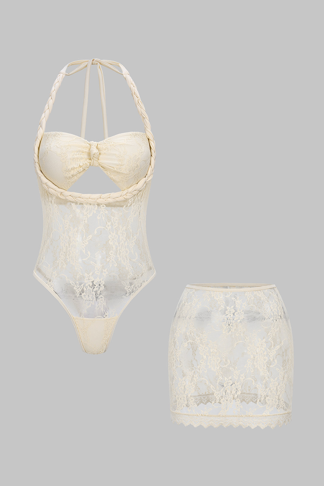 Sheer Lace Braided Halter Tie-Up Cut Out Bodysuit And Skirt Set
