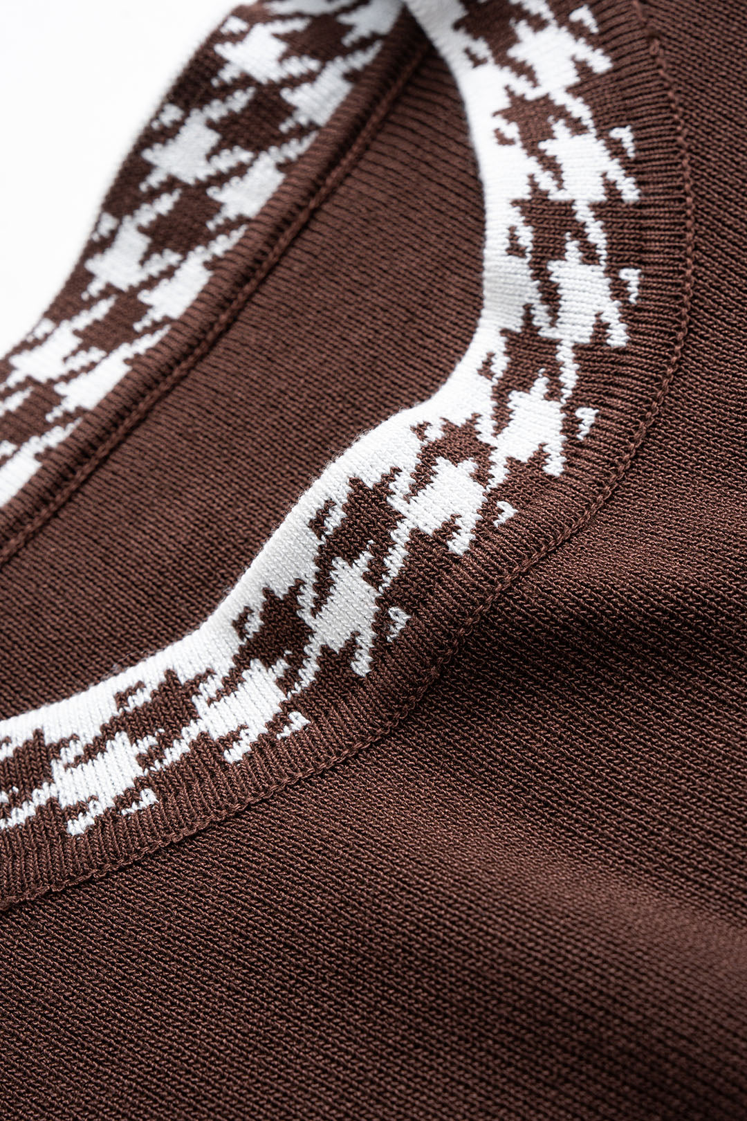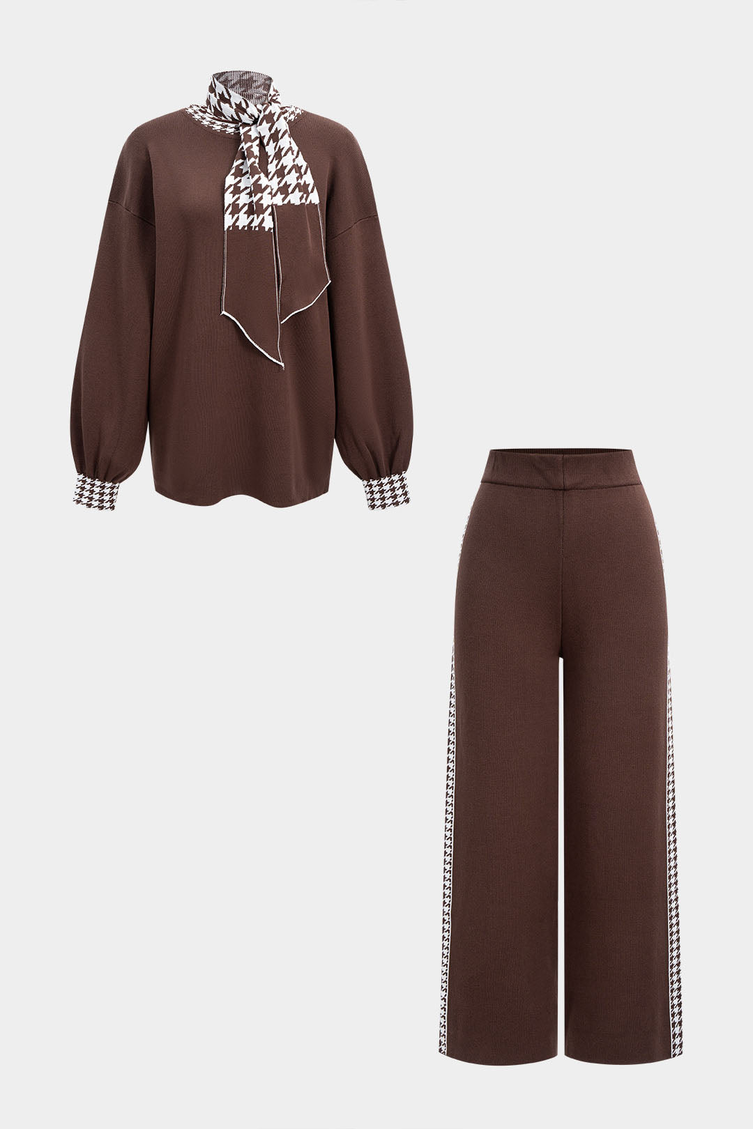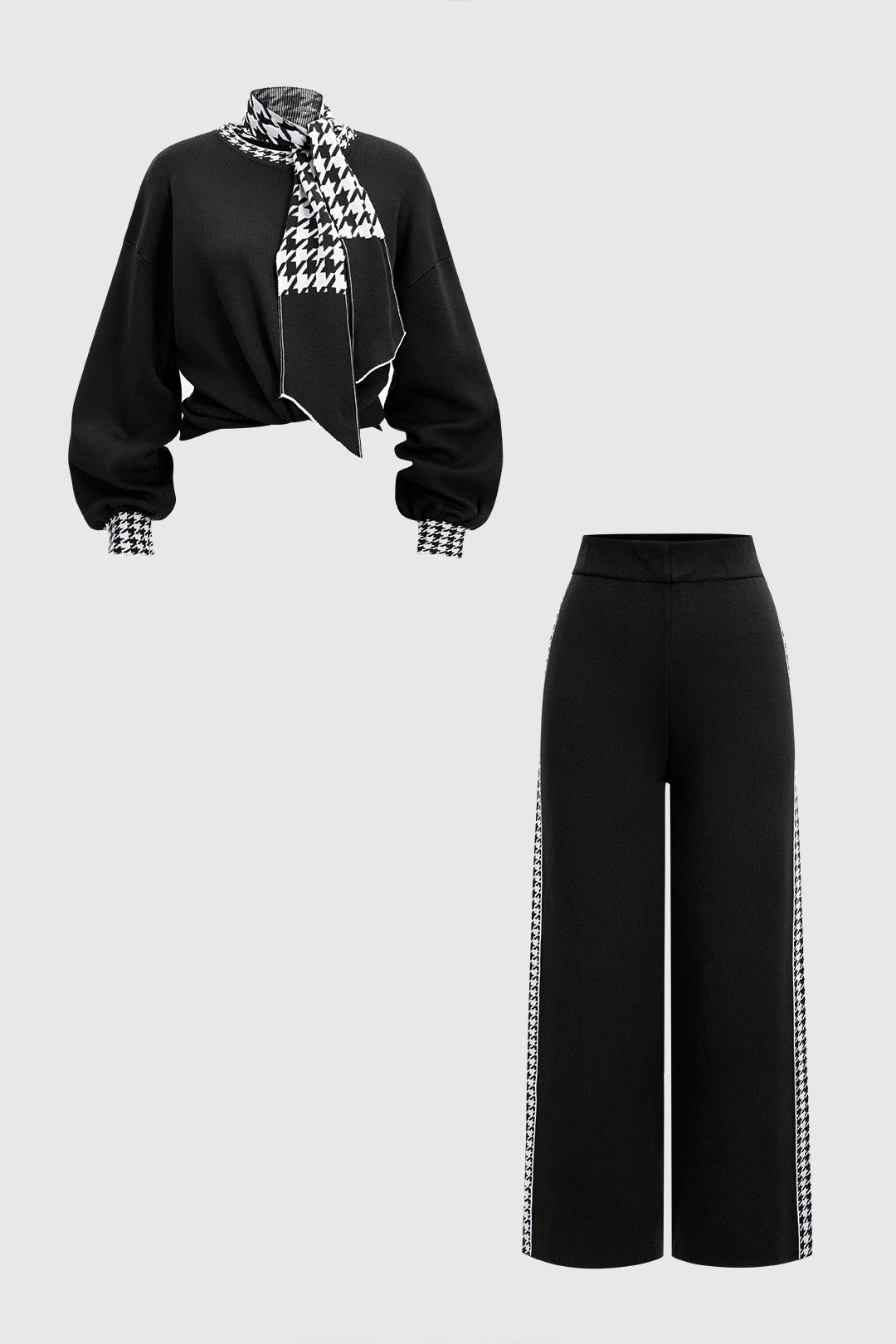 Houndstooth Print Knit Strappy Long-Sleeved Top And Straight Leg Pants Set