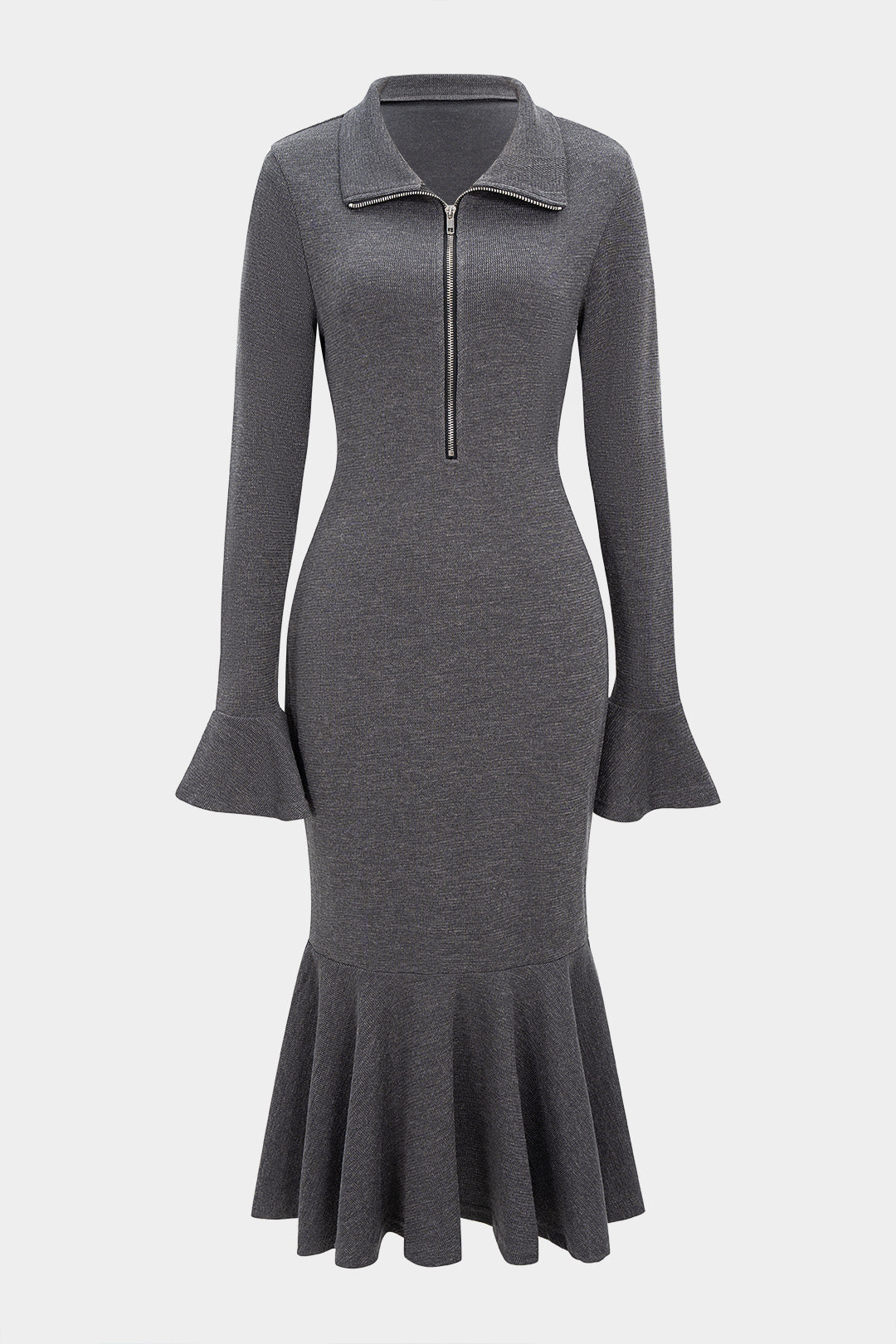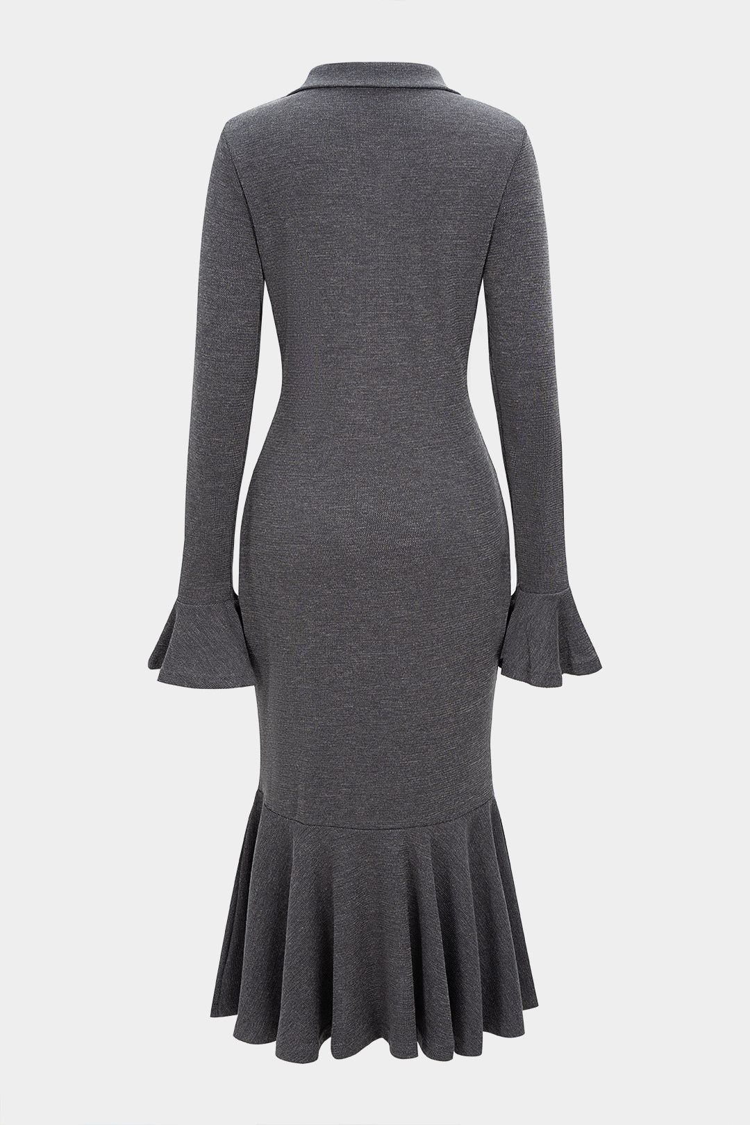 Lapel Ruffle Hem Zipper Bell Sleeve Midi Dress
