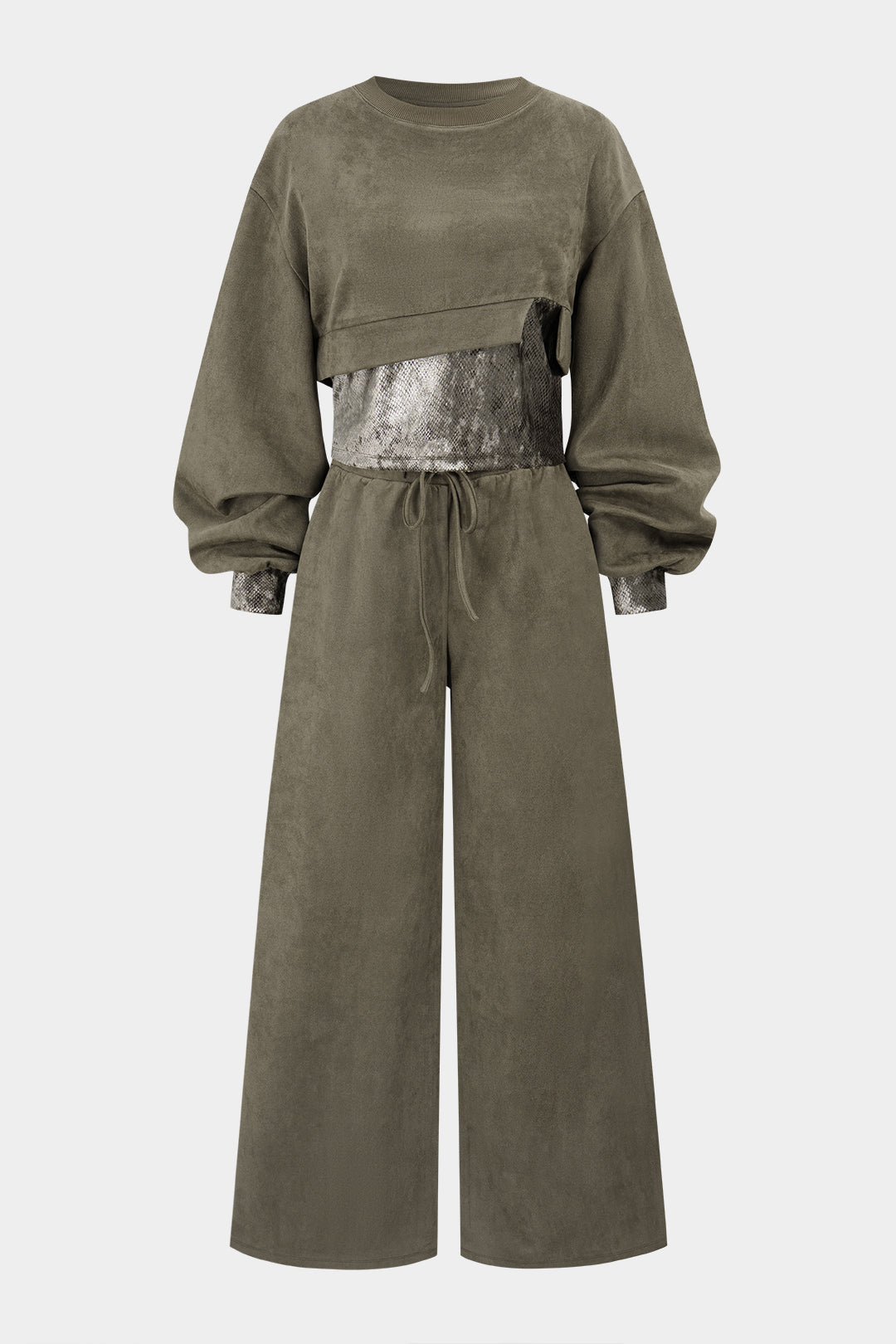 Snake Skin Print Suede Asymmetrical Sweatshirt And Drawstring Wide Leg Pants Set