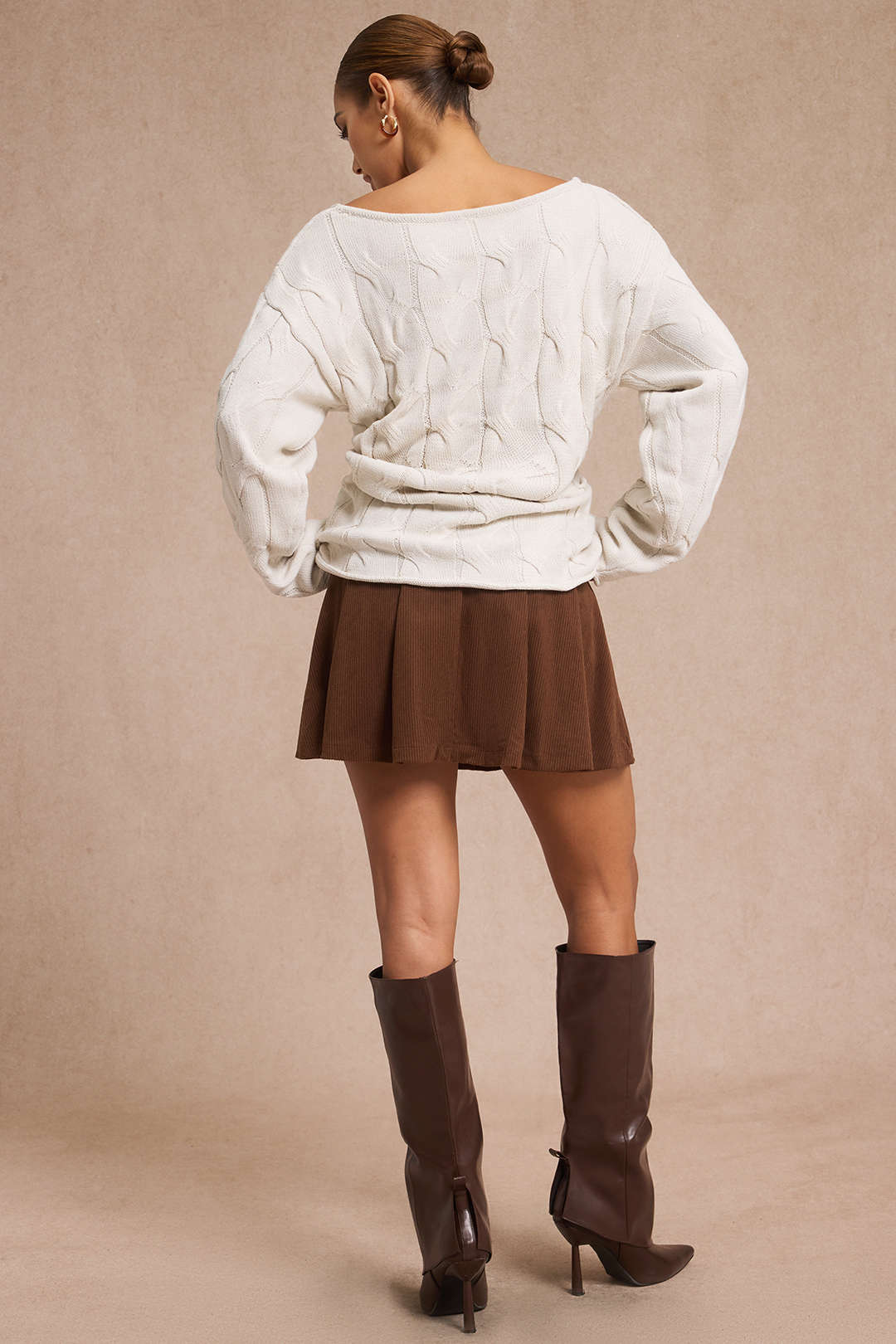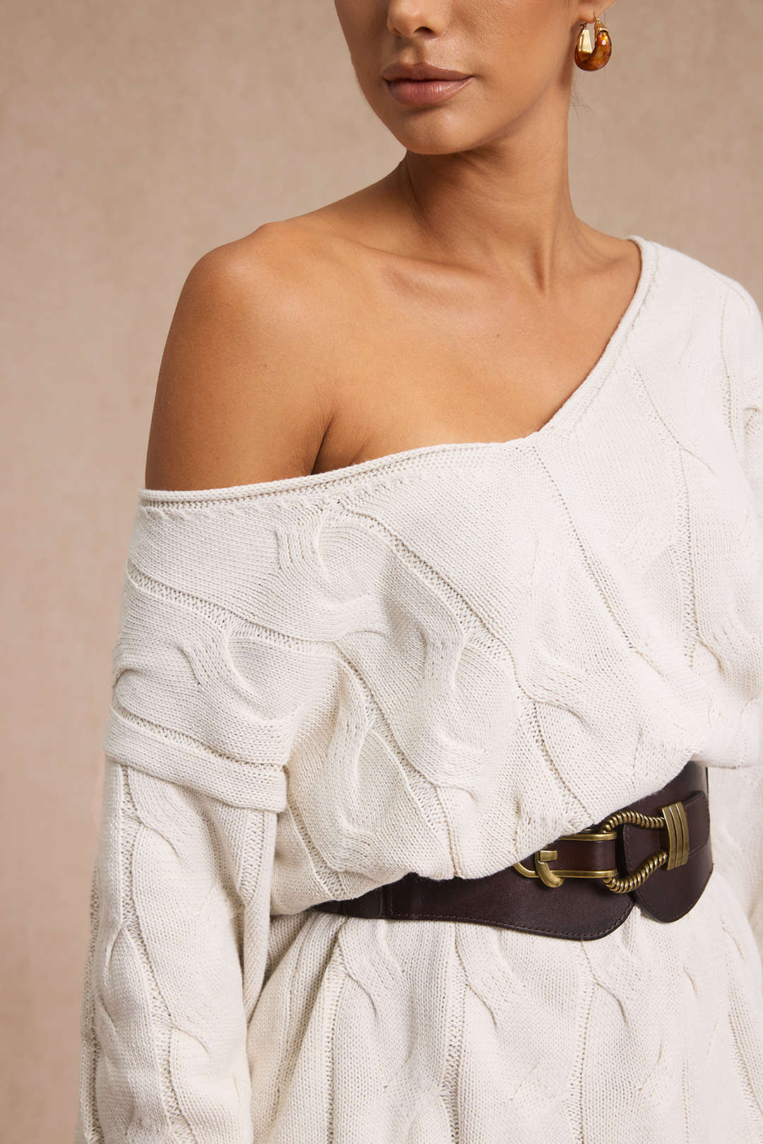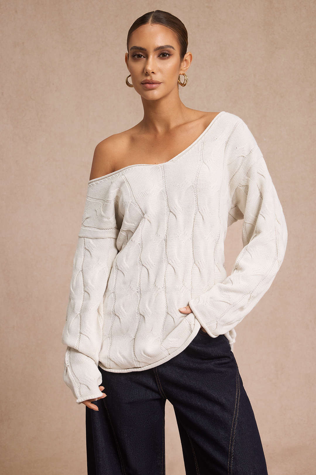 Cable Knit Asymmetrical Neck Long-Sleeve Top