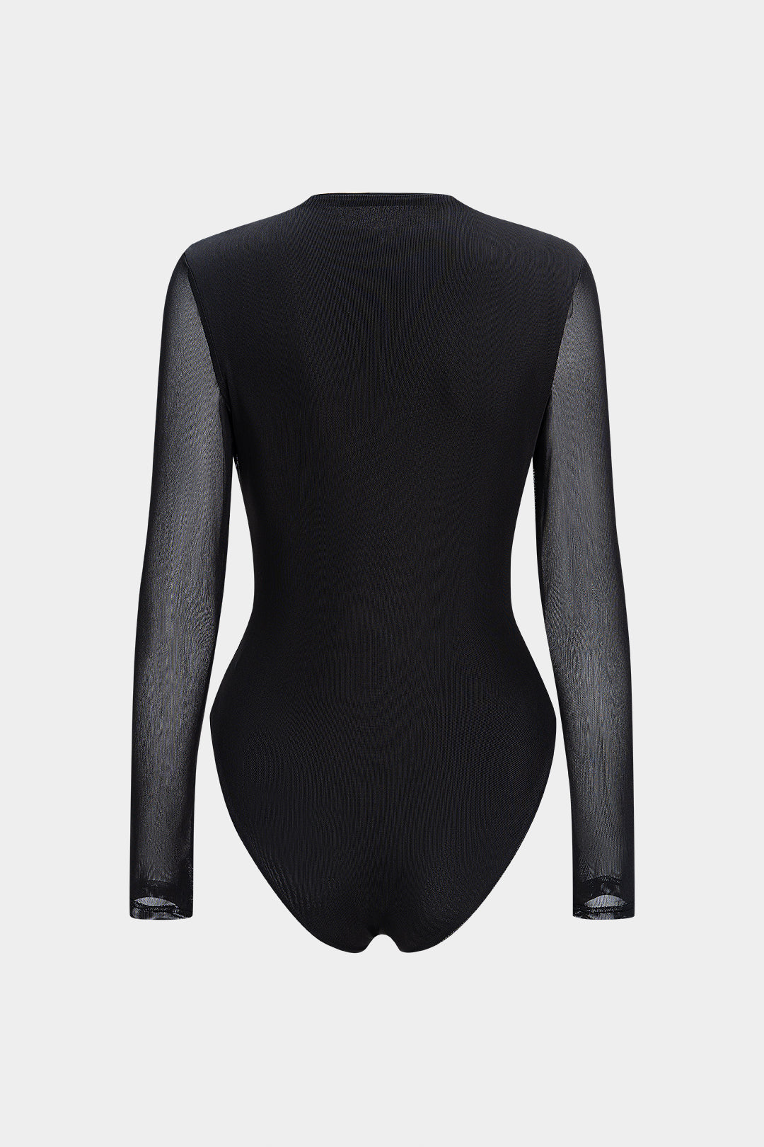 Sheer Mesh Patchwork Round Neck Long Sleeve Bodysuit