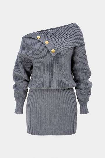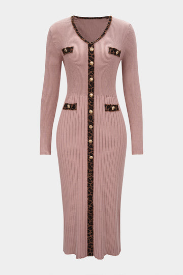 Knit Metallic Button Ribbed Long Sleeve Dress