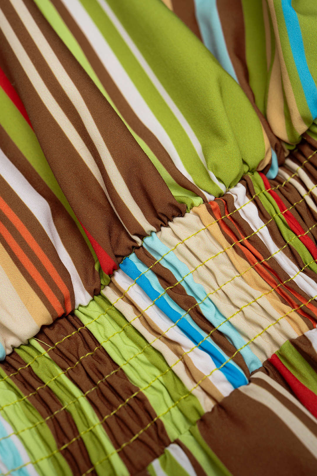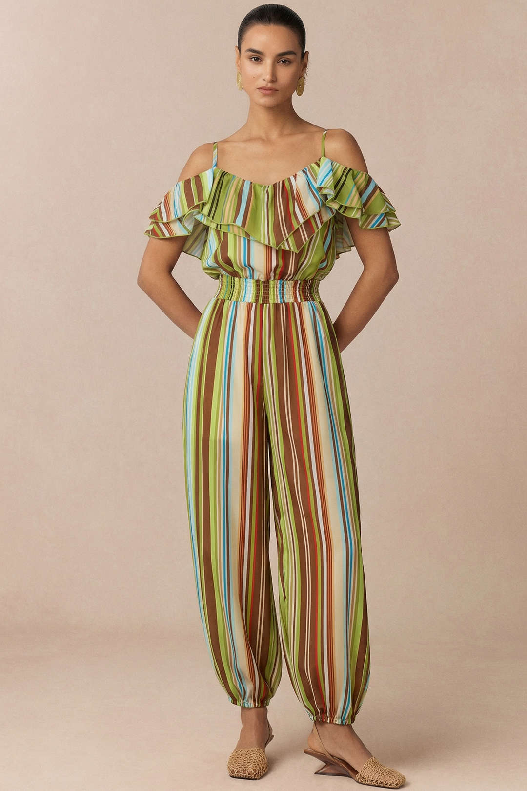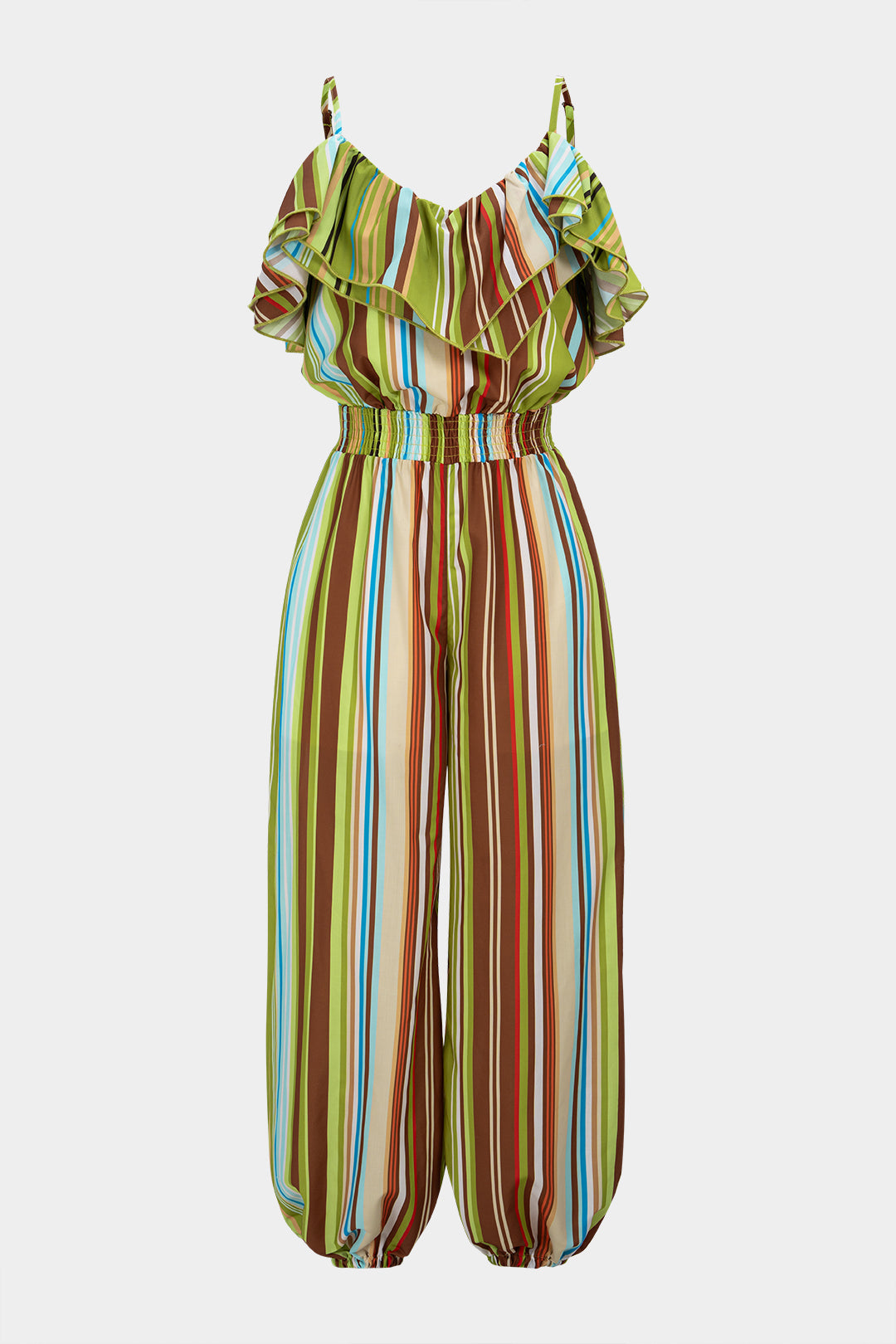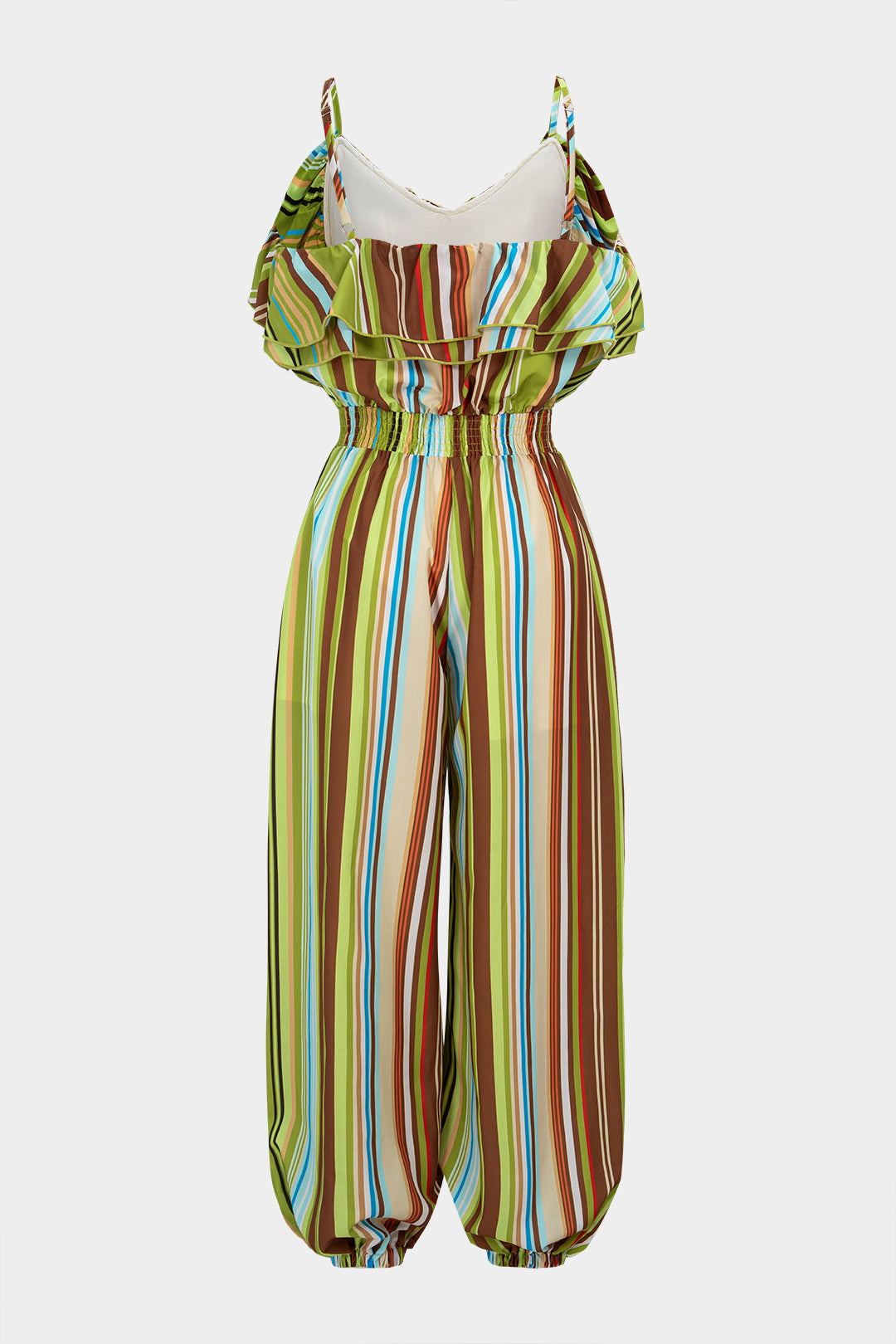 Stripes Print V-Neck Ruched Shirred Sleeveless Jumpsuit