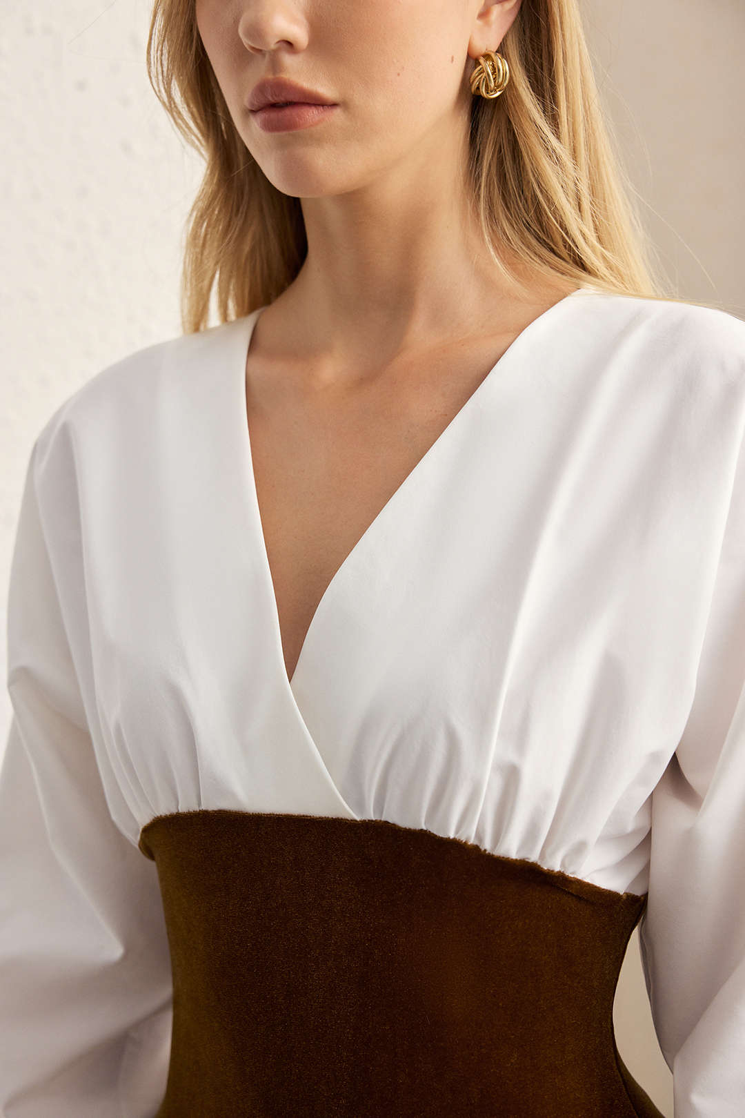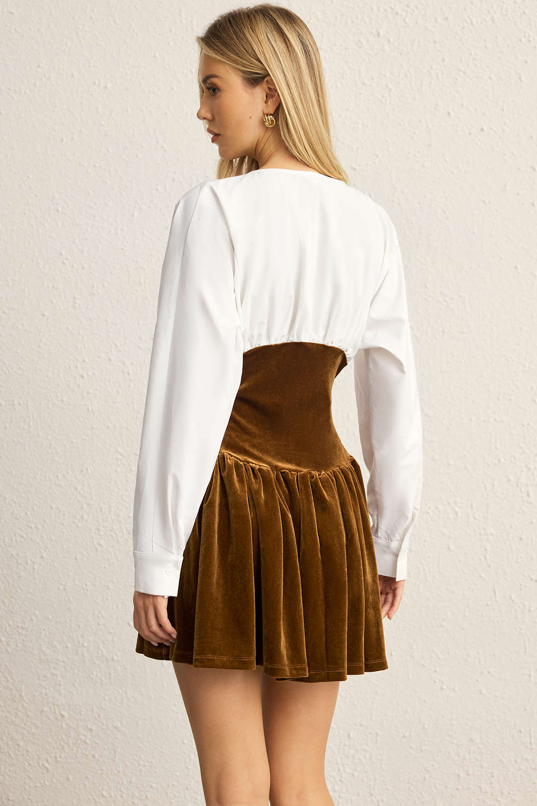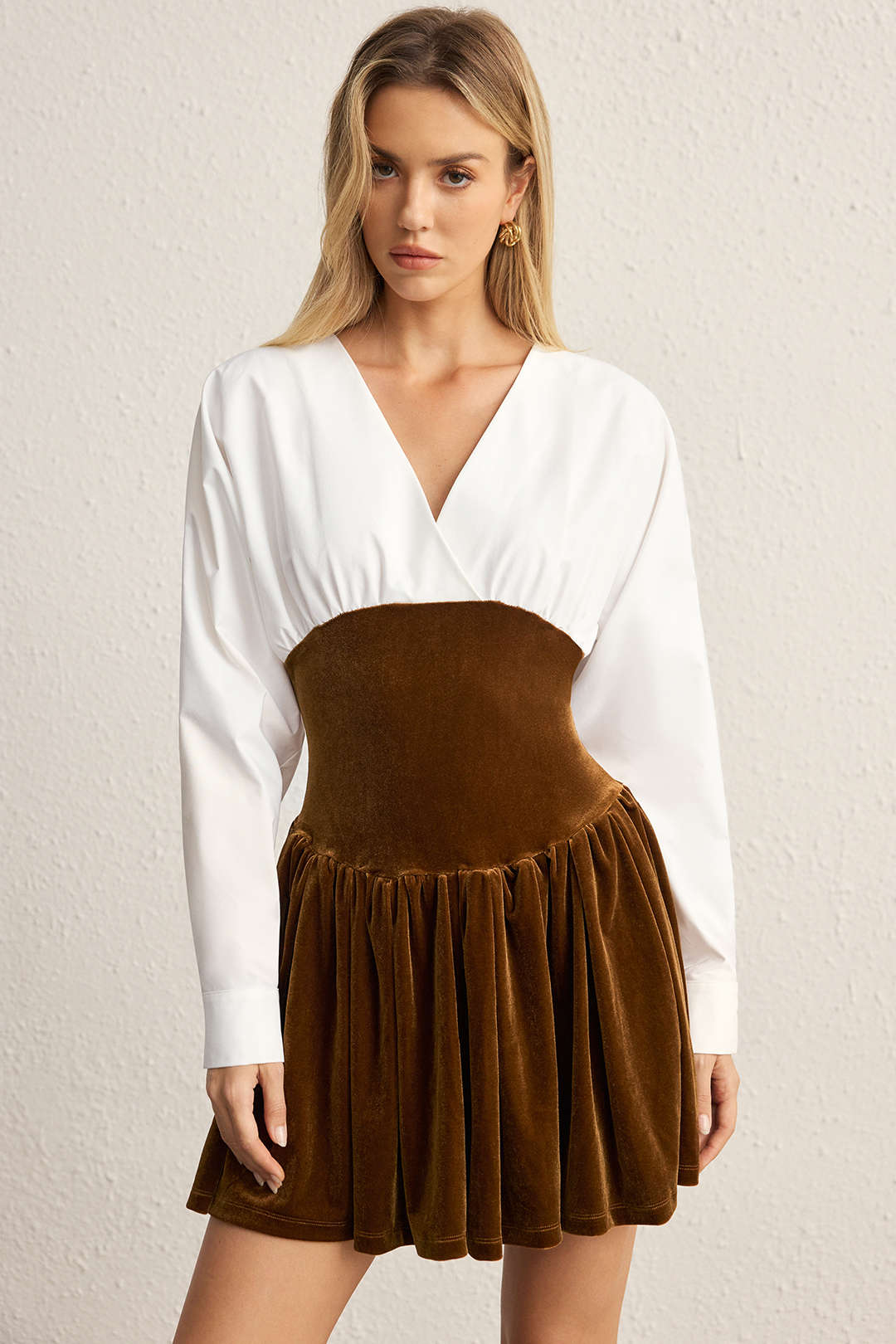 Velvet Patchwork Ruched V-Neck Long Sleeve Mini Dress