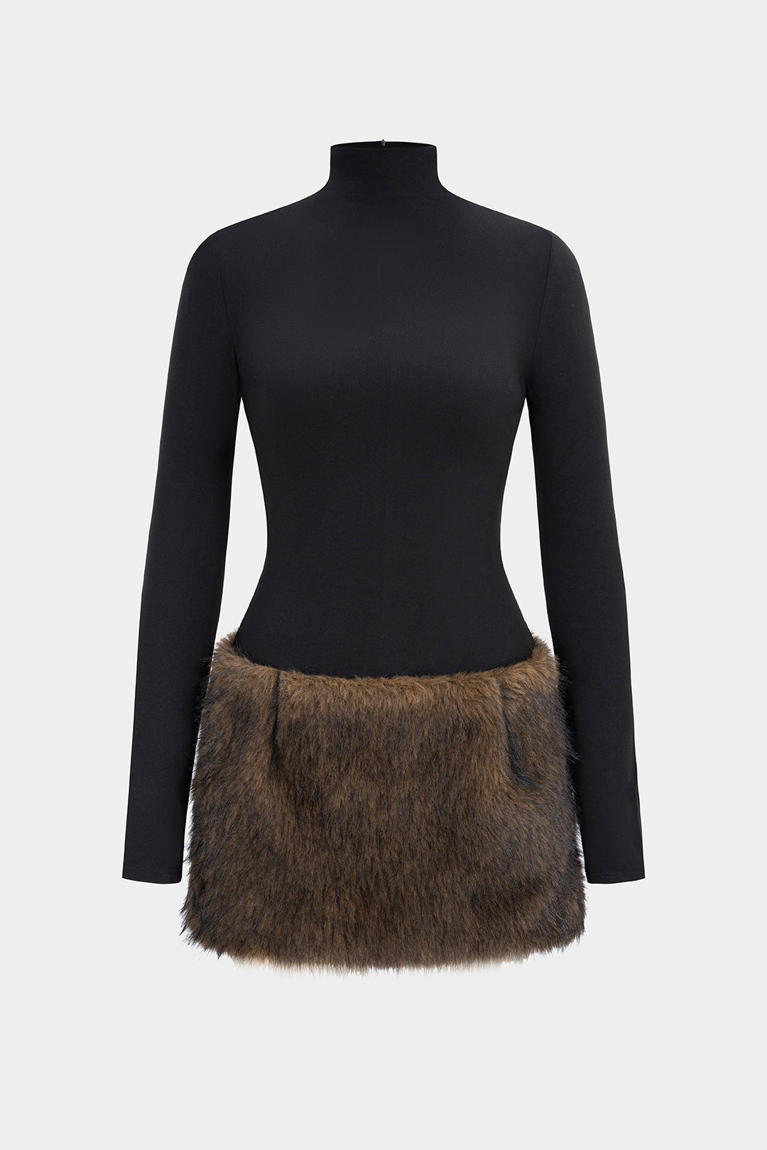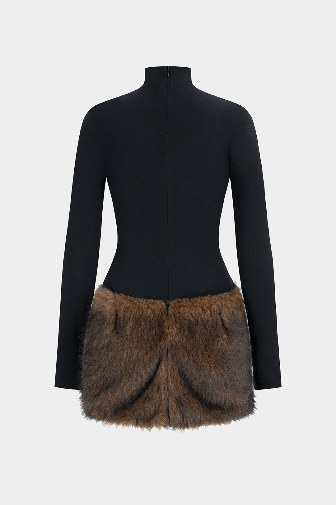 Mock Neck Patchwork Faux Fur Zipper Long Sleeve Mini Dress